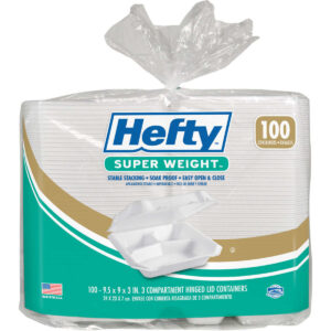 Hefty Foam Super Weight 3-Compartment Container, 9″W x 9″L, White, 100 ct