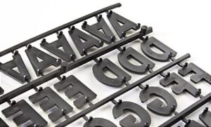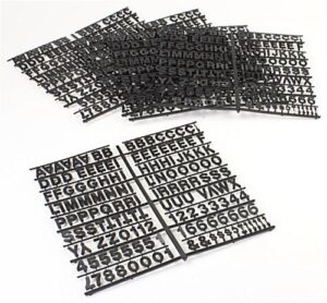 This letter kit includes six sheets, totaling 930 individual numbers, symbols and ABCs. The plastic characters insert into a grooved or track-style menu display, such as the MNULTBDLG. The letter kit, also known as changeable inserts, features tabbed backing to easily clip each unit into a board. This business sign set is made from black, injection molded plastic, contrasting perfectly against white letterboards. This letter kit has inserts measuring 1″ tall to fit most menu displays and boards. The changeable sign set gives users the ability to quickly update a bulletin by simply adding or removing characters. The letter kit is therefore perfect for use within restaurants, business lobbies, offices, schools and hotels requiring up-to-date messages and bulletins.
