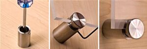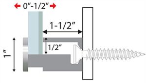 These fasteners, metal stand offs are specifically designed for mounting signage in public settings. (4) Fixtures, screws, anchors and a hex wrench are included with the purchase of this kit. The metal stand offs grip signs from the edge. As a result, users do not need to drill holes for mounting when displaying a panel with this hardware set. The metal stand offs with screws do not have a minimum sign thickness requirement. The maximum panel thickness these fasteners can hold is 1/2″. Metal standoffs that hold a 1 /2″ thick panel are appropriate for mounting a variety of different signage materials such as glass, acrylic, wood and metal. The edge grip design of these fasteners is suitable for mounting mirrors as well. The simple fact that these metal standoffs grip panels from the edge gives them a much more versatile design than fasteners that screw through pre-drilled holes in a sign panel.