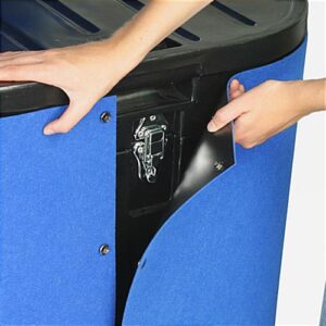 Included with this tradeshow booth is a molded, hard plastic carrying case that features built-in wheels and safety locks. This high quality travel case converts into a display counter that can be used to address crowds, display literature, or demonstrate products. To turn your case into a counter, simply wrap around the included fabric panel and attach the laminate countertop. The fabric panel is made out of royal blue hook and loop receptive materials to match the display and give your tradeshow booth a unified look. In addition to this conversion kit, we sell this tradeshow booth with two halogen spotlights. A foam-padded storage compartment in the case keeps them safe from damage during transportation and storage.