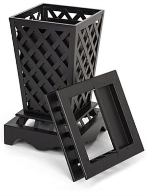 No more fiddling with swing doors or fast-shutting lids because this open top outdoor garbage can features a 13” wide opening. This beautifully decorative waste bin is constructed of cast aluminum and features a basket weave design on all four panels. With the 10-gallon capacity, this open top outdoor garbage can fits nicely in public parks, outside restaurants or office buildings, townhouse complexes, or anywhere you want to hide unsightly trash. This beautiful black decorative cast aluminum waste bin has a height of 33.5” and width of 18”. The container comes with an optional ashtray inside the top lid, which is removable for gaining access to the pull out bin. Help keep public high-traffic areas clean and litter-free with this open top outdoor garbage can.