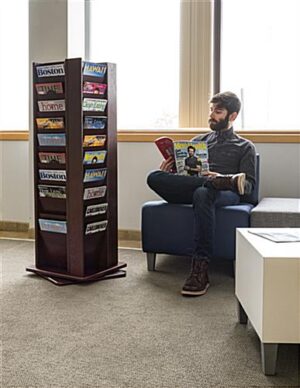 This spinning mahogany magazine rack has forty pockets measuring 9″ x 8″ x .75″. This tiered design allows you to have the front cover visible no matter how much literature is on display. The entire mahogany magazine rack rotates on its base making an easy browsing experience for customers. Entire dimensions are 18″ wide x 50″ high x 18″ deep. Each magazine rack features solid oak construction and a red mahogany finish. The durable and classy looking displays require minor assembly for a quick setup.
