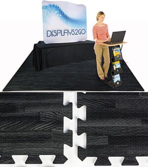 Create an elegant, comfortable and durable trade show experience for your customers and your staff with these black wood grain floor mats. Cheaper and more appealing than tradeshow rental flooring, these cushioned tiles will add an element of comfort and style to any event space! Each set comes with (26) 2’ x 2’ soft EVA interlocking foam pieces that fit together snuggly like a jigsaw puzzle for a 10’ x ’10 flooring area. The aesthetics of these stain resistant, wood grain floor mats are only emphasized by their cushioned comfort. The interlocking foam tiles are lightweight, portable, water, oil & stain resistant and super soft, making it the ideal anti-fatigue flooring. These wood grain floor mats are the perfect addition to any trade show or event flooring.
