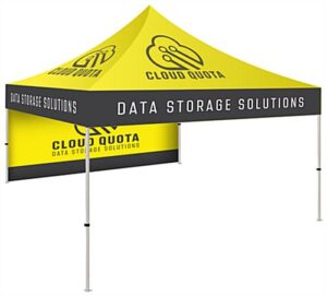 | Custom Printed Event Tent | 120.0″W x 122.5″-132.0″”H x 120.0″D | 57.0″W x 10.5″H x 14.0″D | Polyester; Aluminum | Silver; Custom | 43.5 lbs. |