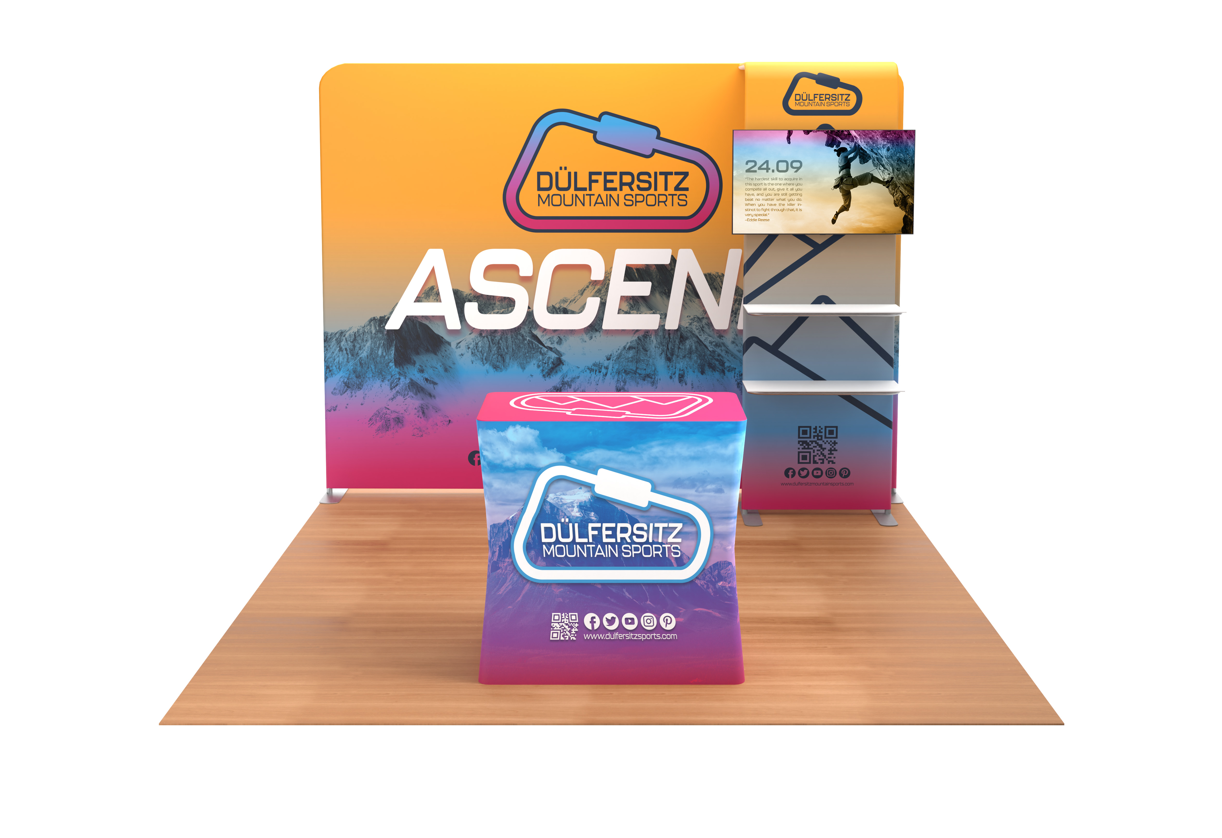 Custom Printed, Double Sided 10×10 Trade Show Booth Display with Monitor Mount and Shelves