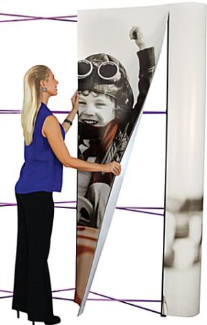 The trade show booth design has a large mural banner frame featuring high resolution, 1200 dpi panels with your company design. The mural is 10′ wide x 7-1/4′ tall, easily standing out in any location. The trade show booth design also has a molded hard plastic case for shipping and transport. Custom banner graphics are printed directly onto 22mil PVC panels with a matte finish. The key feature of these panels is they do not tunnel or separate, even after years of rolling and transport! This case has wheels to easily bring the unit to your spot on the show floor. Buy these great tradeshow units for use at your next company event!