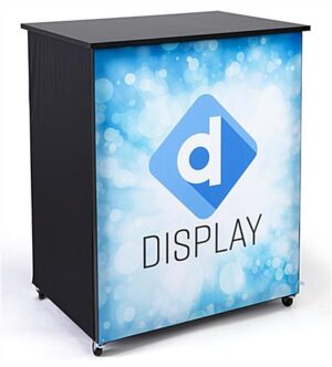 This 10′ trade show booth kit is the perfect all-in-one solution for your next exhibit or convention. A lightweight aluminum frame fills the back of a 10ft booth and breaks down flat for easy transport. The silicone edge graphic front panel with dye-sublimation printing technique provides vivid full color imagery to attract visitors. The portable trade show booth kit includes a counter with SEG graphics on front and black stretch fabric for the sides. Swivel caster wheels provide easy mobility, and two interior shelves can be used for holding supplies. Use the black tablecloth to display a 1-color logo on the front of any 6ft table. The convenient dual duty brochure holder can be used to hold signage and dispense literature. Use the removable pegs to divide the pockets to fit either 4″ wide brochures or 8 1/2″ wide magazines. Additionally, the booth kit comes with a 2-tier clear acrylic business card holder with a snap-shut lid that stays closed for storage.