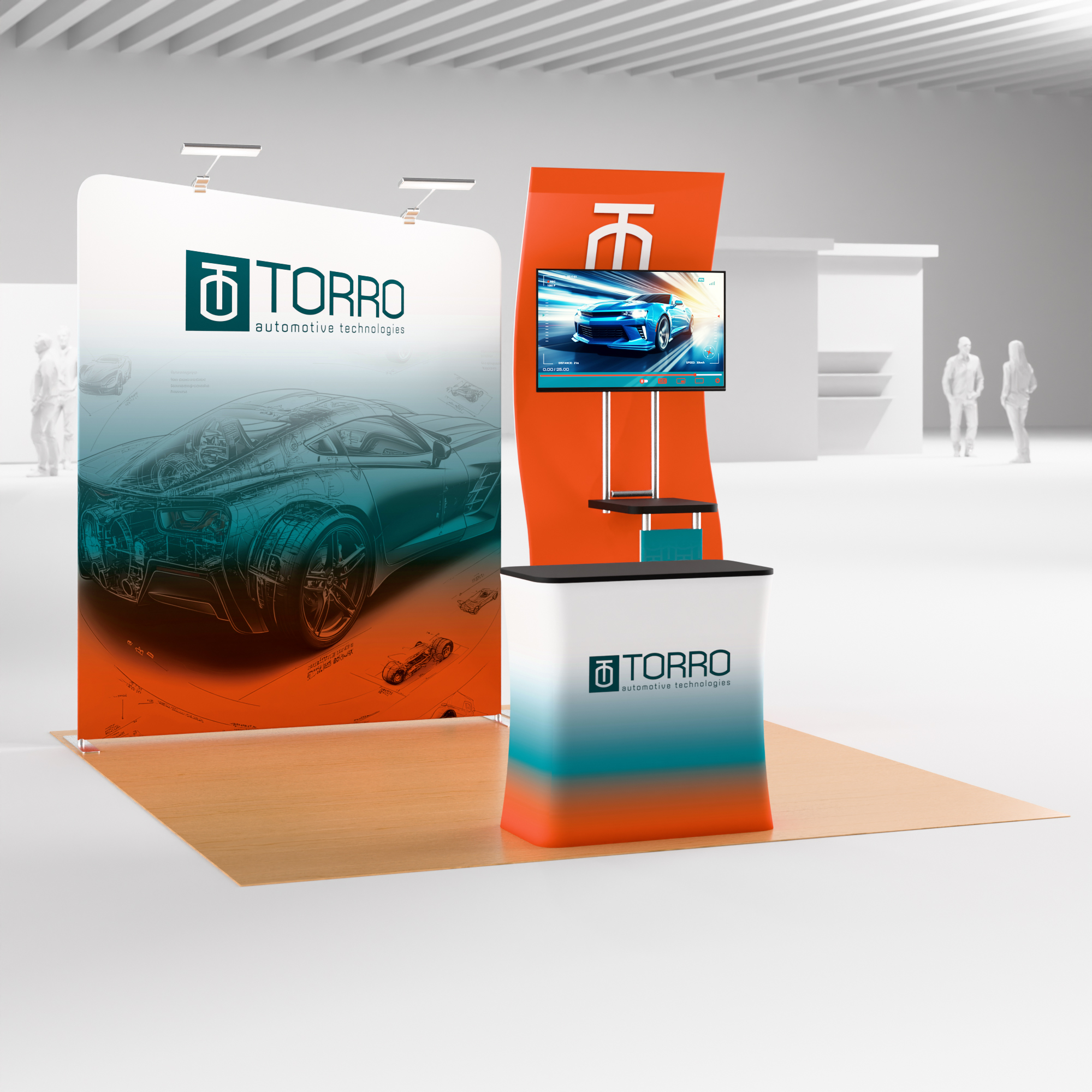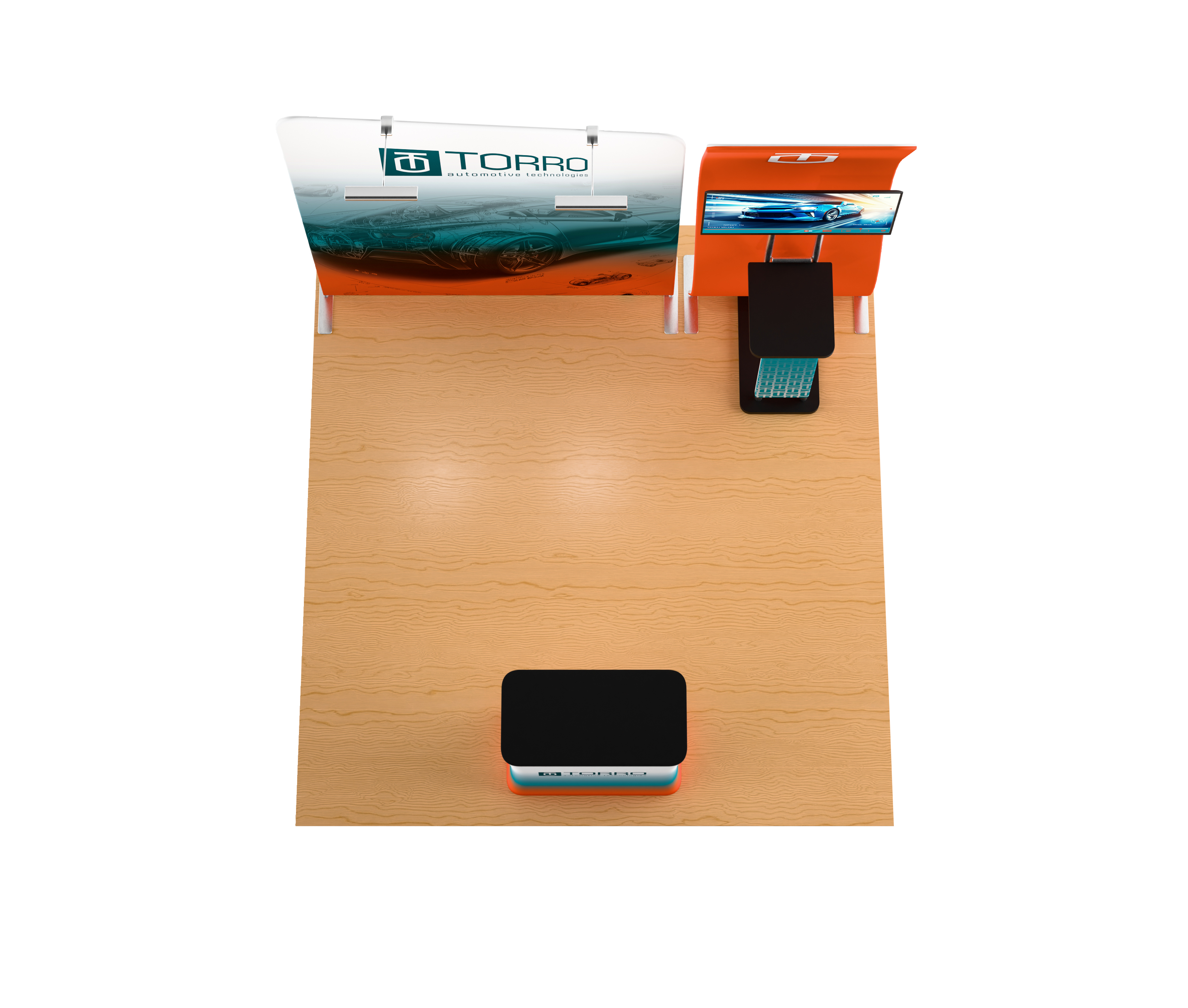 Includes: 8’H Slanted Backwall, 8.5’H Waveline Media Panel, VESA Mount, Shelf, 4 Custom Printed Graphics, 2 LED Spotlights, Hard Shipping Case