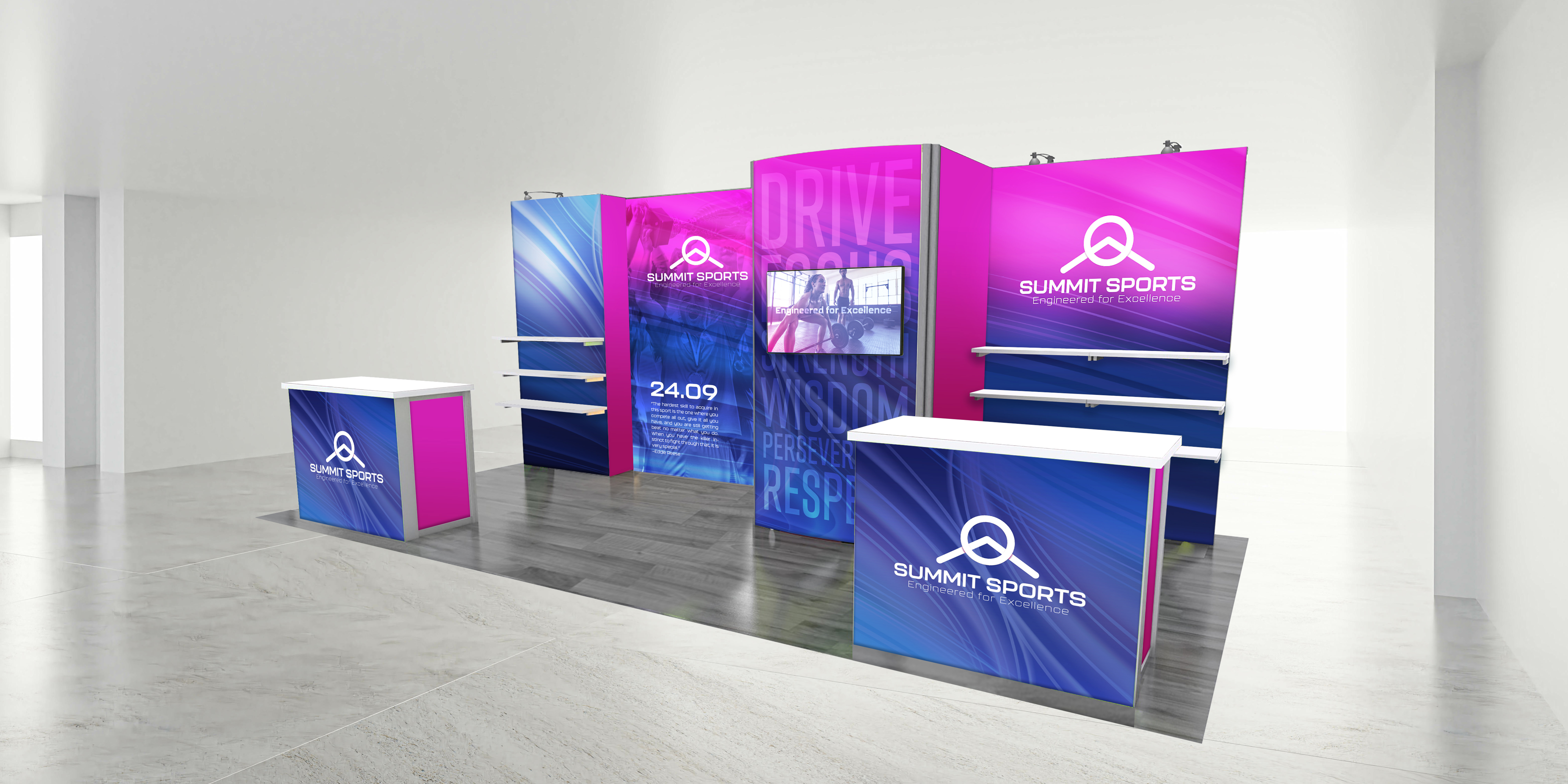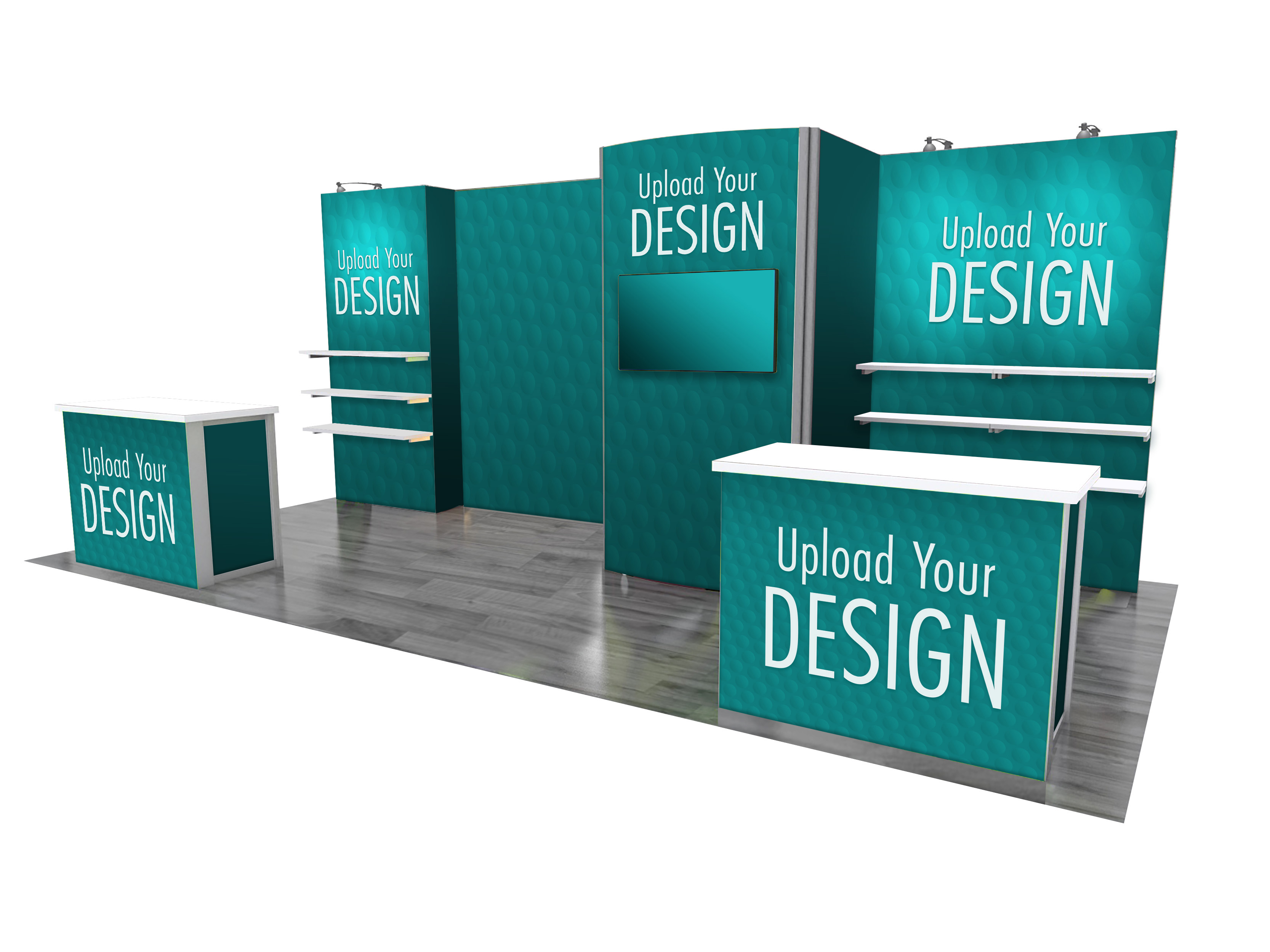 10×20 Modular Booth Display w/ SEG Graphics, Counter, Shelving and Monitor Mount