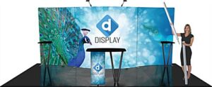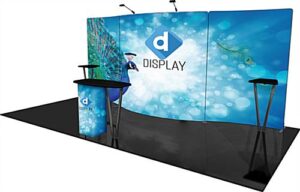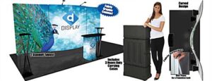 An exhibit display system is a great way to make trade show booths pop by creating an impressive backdrop for guests and visitors. The curved 3 panel structure creates a large 18 ft wide by 8-1/2 ft tall setting to effectively promote products. Included with this all in one kit display system are two standoff tables and one fabric graphic counter. Both this counter and the panels feature custom printed graphics with your choice of art which are printed on a stretch fabric that fits perfectly over the Vector structure and pulls the artwork taut eliminating wrinkles for a smooth and polished look. Each display system also includes two 120w LED floodlights that illuminate the backdrop for an eye catching booth. The staging is a pop up fixture which can easily be assembled into a stunning arrangement with the custom printed graphic panels and disassembled into a portable carrying case with wheels for easy transport.
