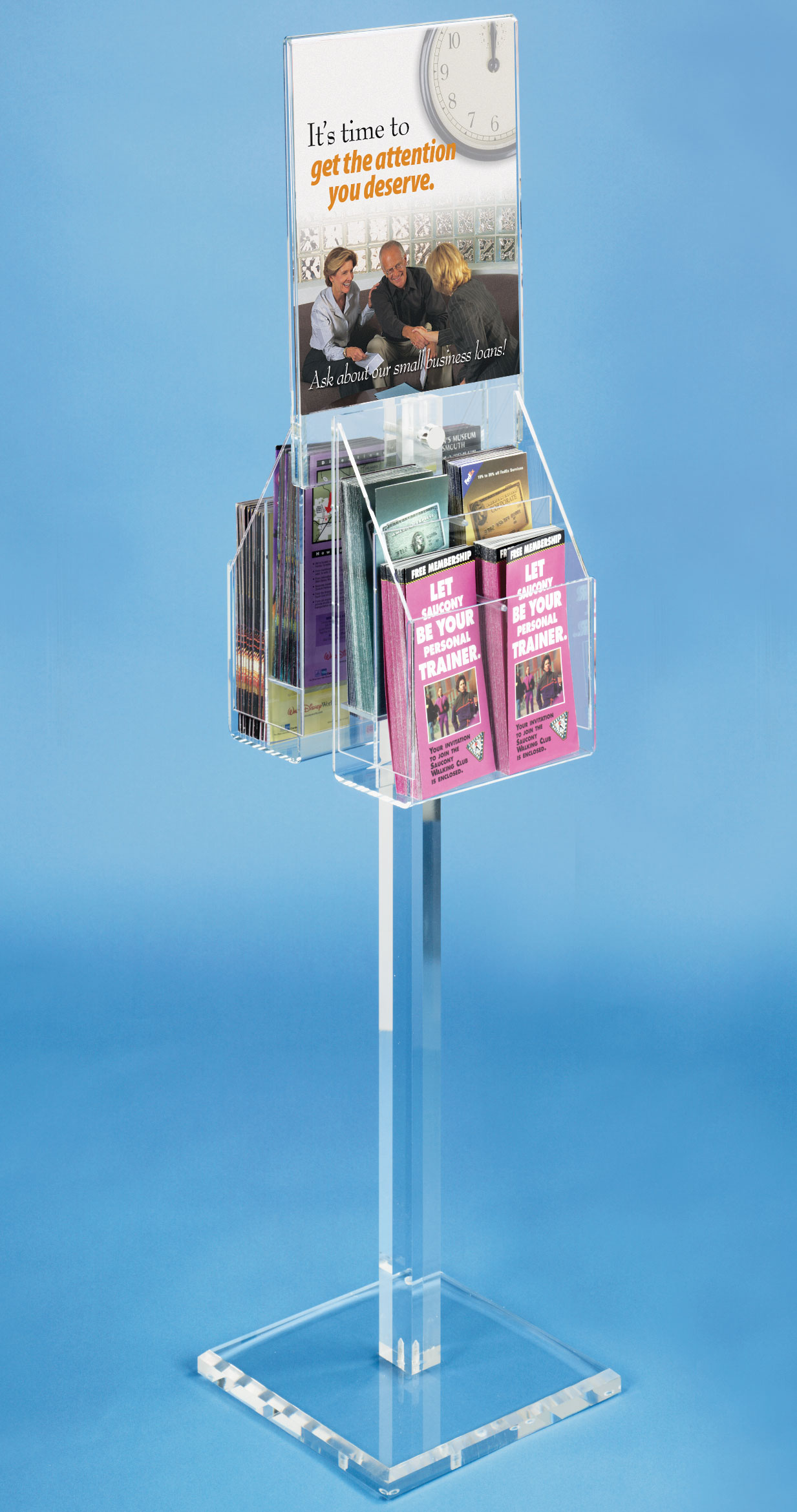 Literature stands with brochure holders – Acrylic stand is 53″h with a 11″wide by 14″high sign holder. This display rack comes with 8 adjustable literature holder pockets, 4 on each side that can be configured to hold 8.5″ wide literature or 4.25″ wide brochures. Base is 11.75″ square.
