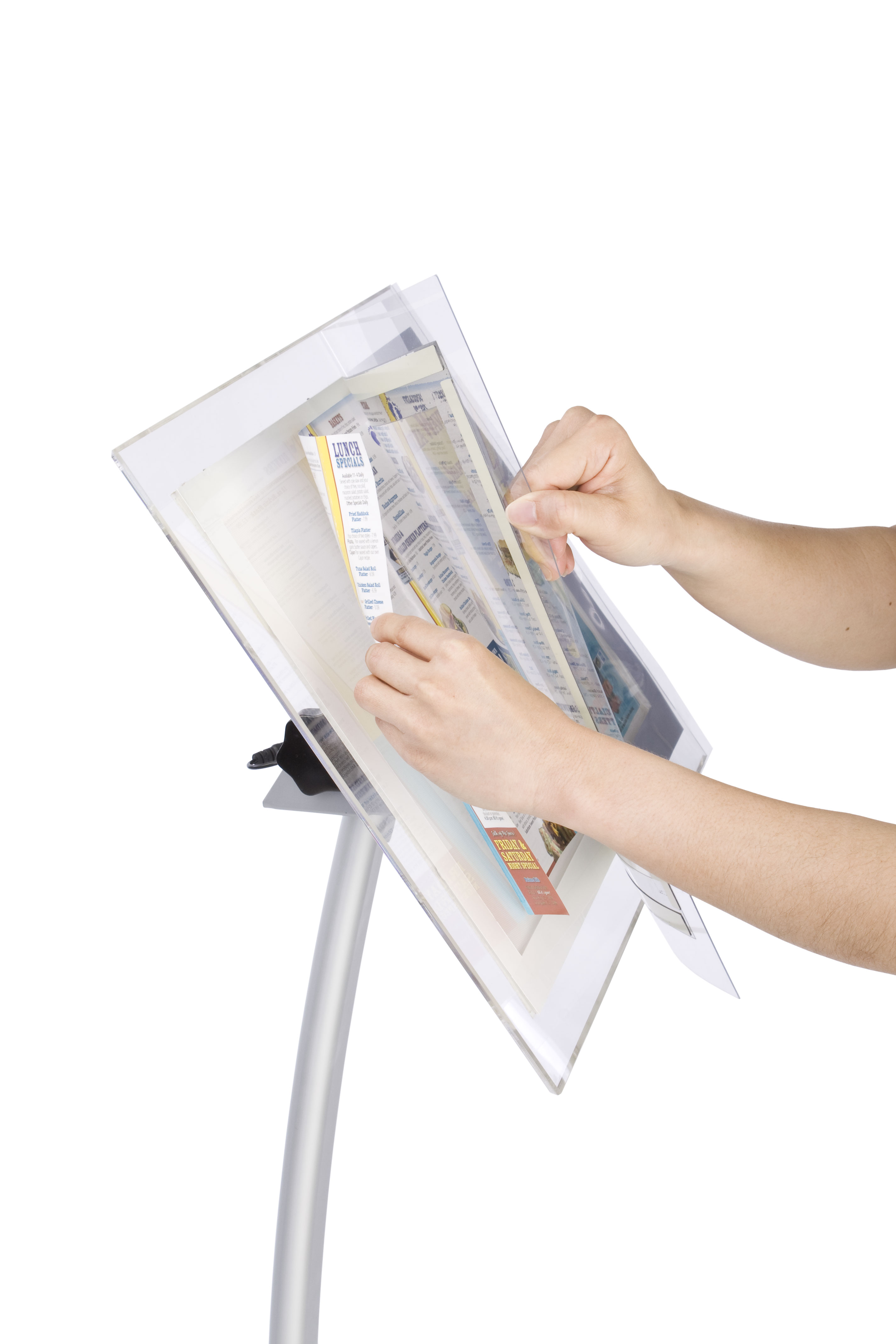 This menu stand with a light up surface is a significant improvement on the traditional floor-standing sign holder! LED lighting illuminates the acrylic signage area of this unit. An illuminating menu stand, such as this food display, is more effective at capturing patron’s attention and luring them into a store or restaurant. The LED lighting illuminates the beveled edges of the acrylic display plate as well! This menu stand that tilts, also known as a sign holder, is more captivating than similar displays, due to the edge lit effect created by the lighting on the beveled acrylic plate. The frame is 3/8″ thick and creates a 1-1/4″ wide border surrounding the signage area. The illuminated sign surface of this menu stand features a light dispersion pattern that ensures posters are illuminated evenly, and do not have any shadows or “hot & cold” spots. A flexible plastic lens secures graphics in place via magnetic strips. As an added bonus feature, the sign frame tilts, allowing users to position information at an angle that is easiest for customers to read.