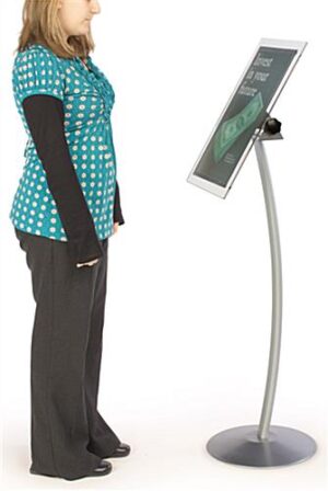 This graphic holder has a lens with magnets on the top corners to hold your image in place. To change out graphics, simply lift the lens, insert your sign, and place the lens back down where magnets securely hold it in place. This poster display, graphic holder uses a black border to frame the images. The curved post offers a unique look that will capture the attention of passersby. This graphic holder, also known as a sign stand and a poster display can hold an 11″ x 17″ print in the frame. An acrylic frame, coupled with a curved silver aluminum pole, brings a European feel to any location it is placed in. Use this graphic holder to promote products or services within any retail store or similar environment. This freestanding sign stand is an effective marketing tool, that requires little upkeep, yet creates a lot of interest in the displayed message.