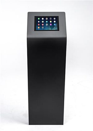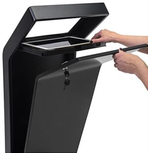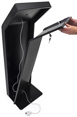 This tablet kiosk stand securely holds an Apple iPad Pro 12.9″ or Microsoft Surface Pro inside a sleek modern enclosure. The locking back panel provides access to hidden cables and tray, and device installation is simple with the included foam kit. Each floor standing tablet kiosk stand is constructed with high quality powder-coated steel and aluminum materials for strength, stability, and a premium look. For added security, the base can be bolted to the floor with included hardware.