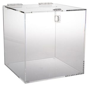 This large clear acrylic lead box, ballot box measures (12″ cube) with a hinged hasp for a pad lock. The slot size on this ballot drop box is 6.25w” x 1/2″. This sweepstakes entry box, also known as a donation box is a perfect countertop display. These transparent lead boxes are often used in town halls as well as for all types of voting in companies.