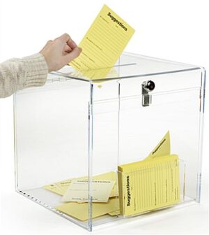 This plexiglass donation box (12″ cube), also known as a safety suggestion box, comes with a key lock and a 6-1/4″ wide pocket for convenient storage of ballot or comment cards. The slot size on this sweepstakes entry box is 6 1/2″w x 1/2″d. This ballot box is also used as an employee suggestion box to collect comments and ideas.