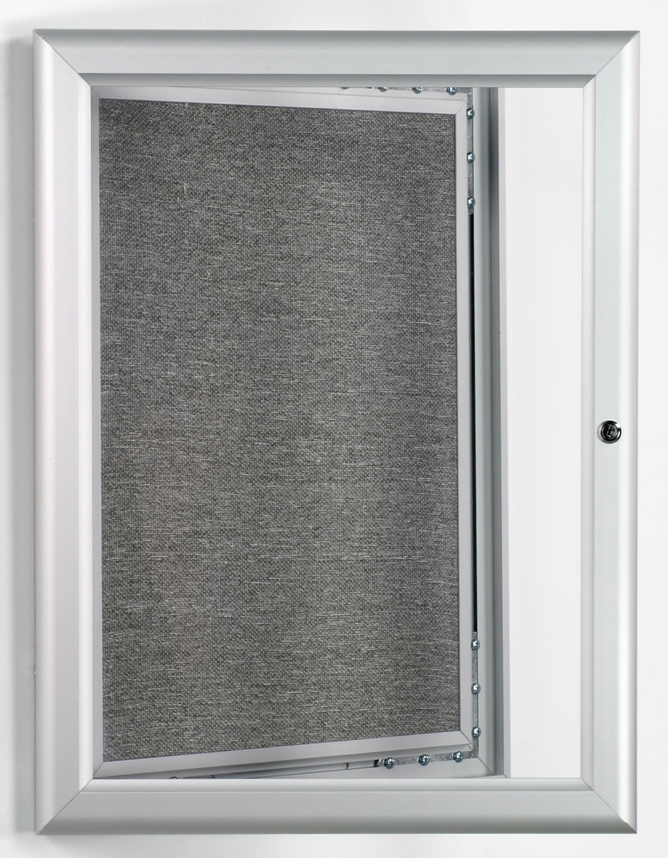 This tackboard enhances office notices and school messages. This bulletin board is covered in beautiful and durable fabric that accepts hook and loop fasteners as well as push pins. This tackboard provides the perfect display area for signs, announcements, messages, graphics, photos and memorabilia. An enclosed bulletin board is a common information posting system. This tackboard is a smaller size and designed to draw attention to important, single sheet postings that can be changed at any time. This tackboard has a single lockable door which provides controlled access to the posting surface.