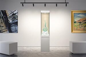 This illuminated museum display case is a floor standing fixture with an LED top light that adds an elegant touch to exhibits in art galleries, showrooms, lobbies, and more. The sleek white showcase has a tan linen backboard, allowing curators to mount items with pins and other hanging methods. This high-end LED illuminated museum display case offers convenient locking storage on the backside, perfect for tucking away supplies or personal valuables. The laminated MDF construction and tempered glass panels help ensure the security of more upscale products in high-traffic areas. Our showcase also includes a locking side door to insert or remove items quickly when necessary. Place this high-end floor standing illuminated museum display case in galleries, exhibitions, school lobbies, and more to feature new products, collectibles, or artifacts.