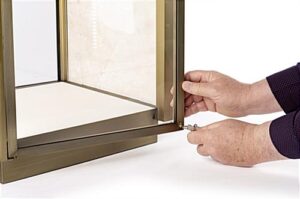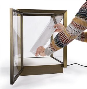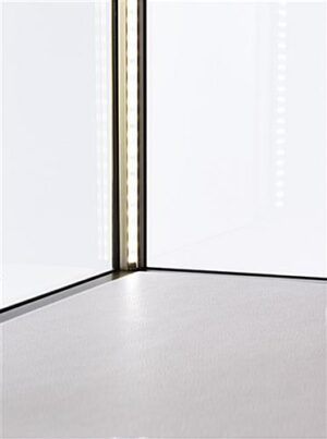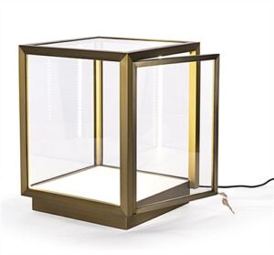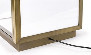 This tabletop display vitrine has a lighted interior that highlights the fine details of enclosed items and creates an eye-catching showcase. Clean lines, a bronze-finish, and large glass panels enhance the modern aesthetic of this stainless-steel shadow box case, letting jewelry, minerals, and precious stones come to life. With its nearly seamless interior sign channel, this museum-style tabletop display vitrine presents custom-printed graphics (sold separately) for use as a backdrop behind a new product, 3-dimensional artwork, or sculptural object. LED corner illumination casts a stunning glow across the white pebbled leatherette interior, making for a dramatic presentation. A subtle lock in the side door panel provides optimal security for valuables without interrupting the clean visual style. With its modern elegance and easily customizable sign panel, this tabletop display vitrine will feel right at home in any retail environment or exhibition space.