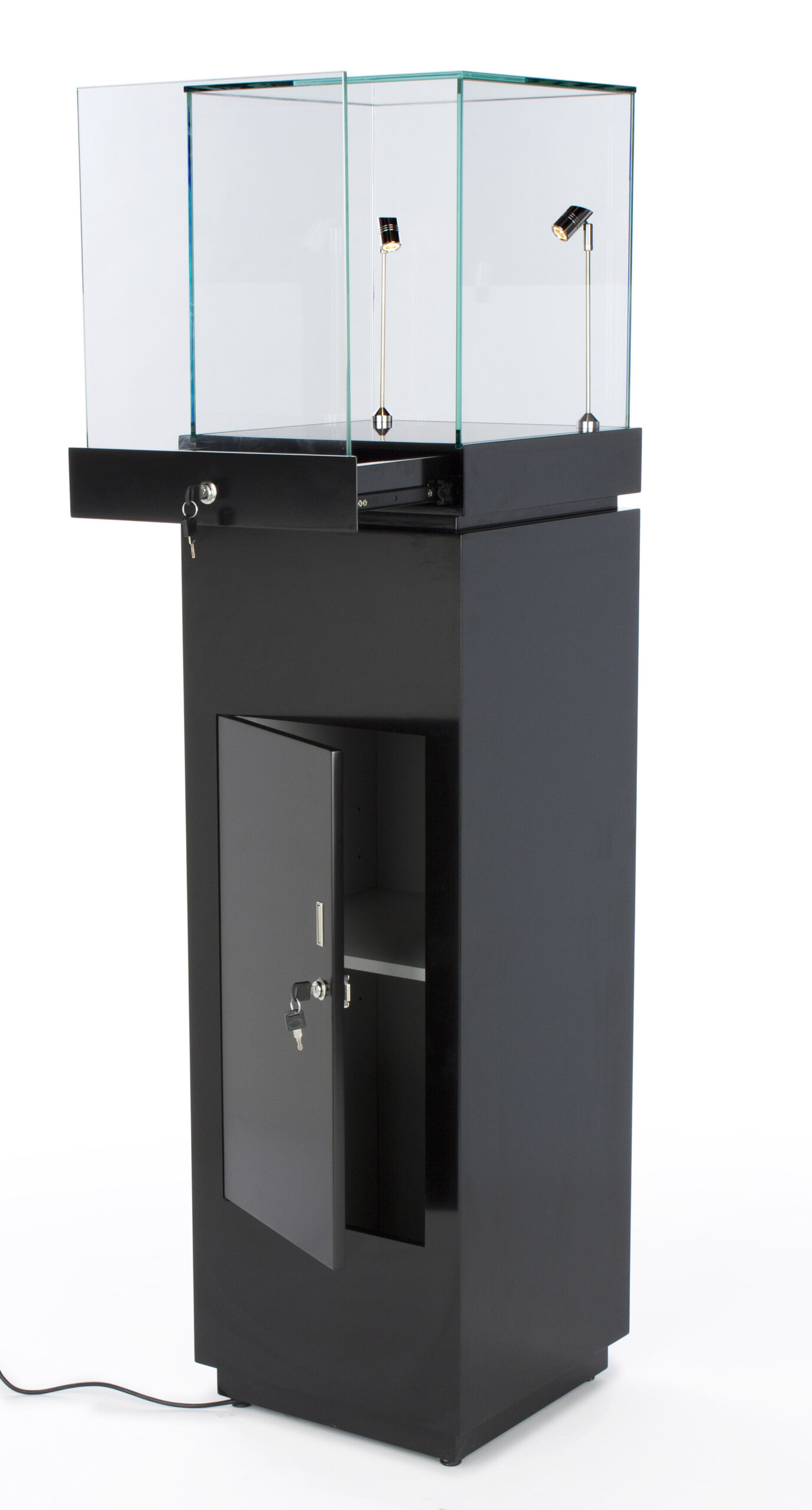 This exhibit case that is carefully packed in a custom wooden crate for safe shipping is heavy, weighing 138 lbs. before removing any packing materials! The exhibit case is eye-catching and will most certainly transform the environment of any museum, gallery or retail store. This stand has a sliding drawer and movable shelf inside the base, both of which lock securely with the included set of keys. These added components accommodate business cards, company brochures, overstock merchandise and other essential materials or tools! The clear tempered glass casing enables viewers to examine the showcase from any angle! This retail display stand, exhibit case has (2) LED lights that can tilt to highlight specific features of the contents! These light fixtures are strategically positioned in the (2) front corners of the display in order to accentuate the merchandise perfectly. This quality glass tower, museum exhibit case is UV glued. This is a glass top pedestal stand, exhibit case that can be used at a gallery, museum or upscale boutique to display all types of items. Use this exhibit case to assist in increasing awareness and sales of featured merchandise!