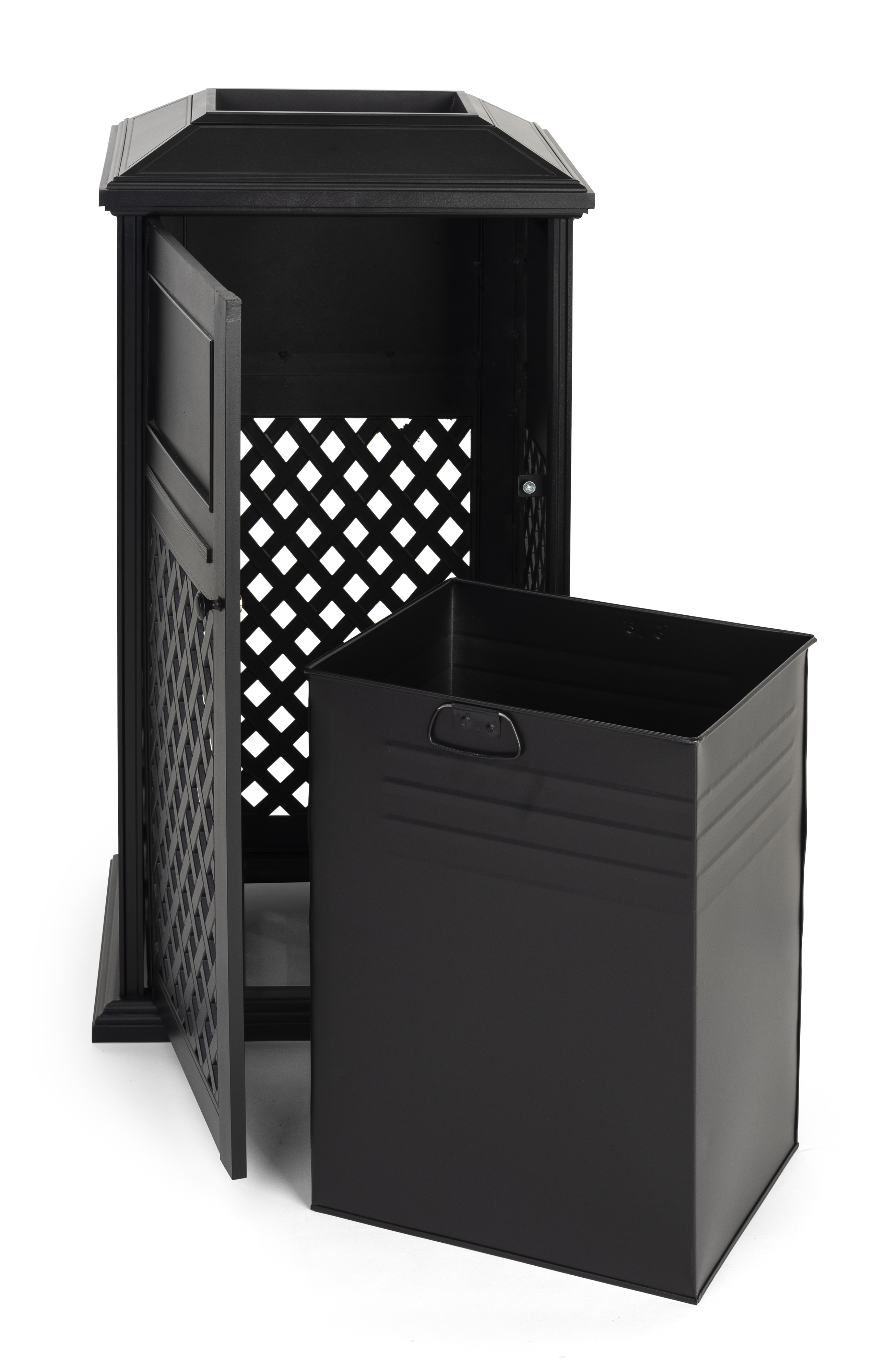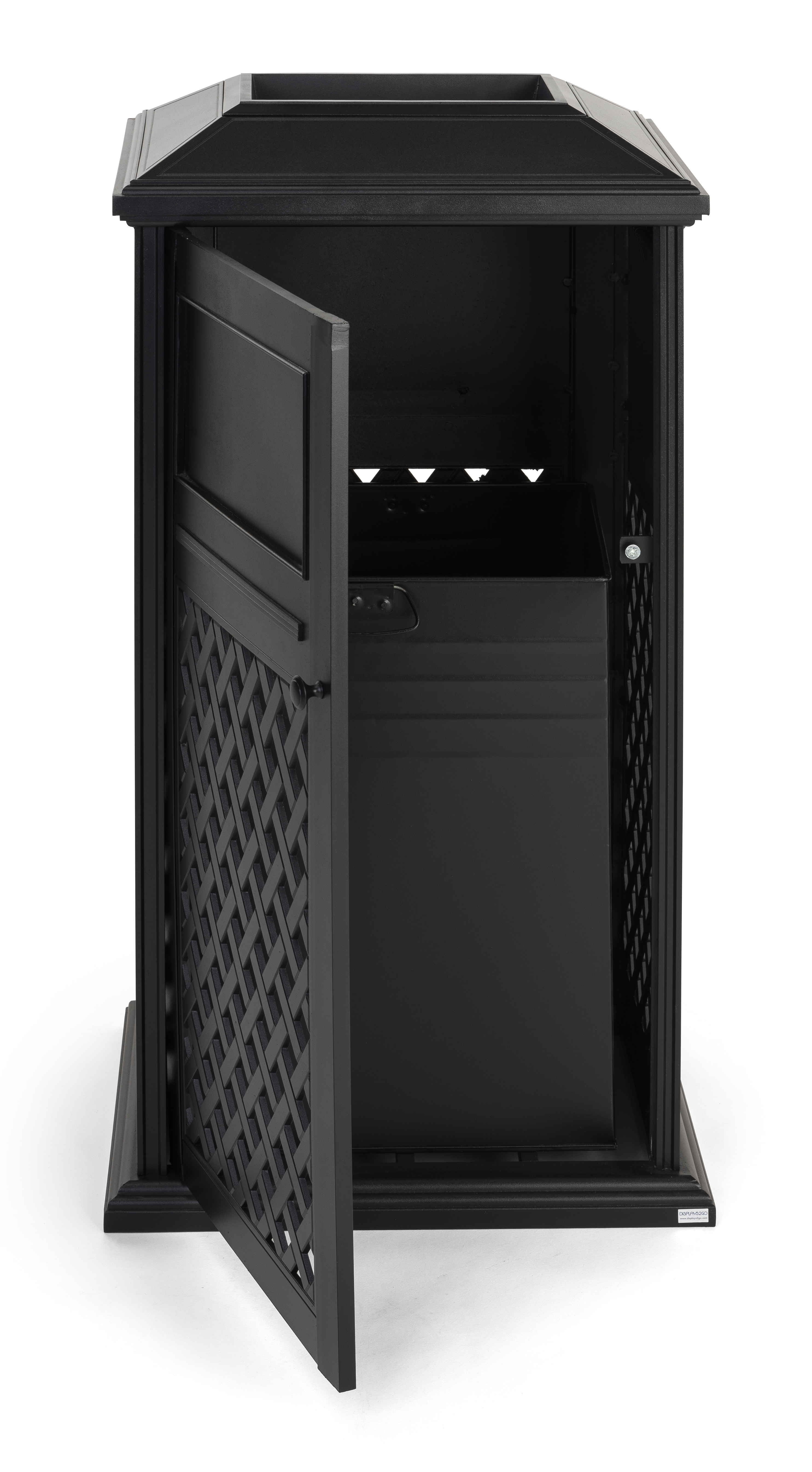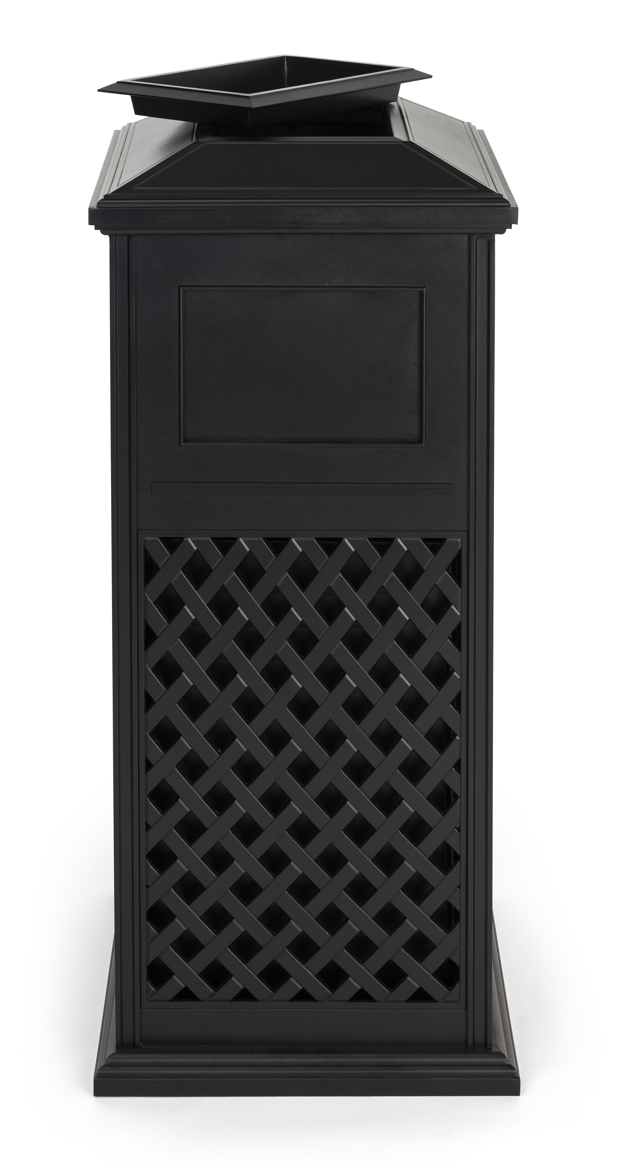 This dome top aluminum outdoor dome trash receptacle would be an excellent choice for any upscale environment. With a capacity of 17 gallons, this beautifully decorative waste bin is well suited for schools, restaurants, office buildings, or parks. This black aluminum outdoor dome trash receptacle features four panels with basket-weave design and is durable and weather-resistant. The front swing open door makes emptying full waste bins easy and effortless. A dome-shaped lid fits snugly atop the unit’s frame and includes a removable ashtray for yet another deposit access. This decorative basket weave aluminum outdoor dome trash receptacle is the perfect solution when you need to solve a sanitation need, but want an eye-appealing container.