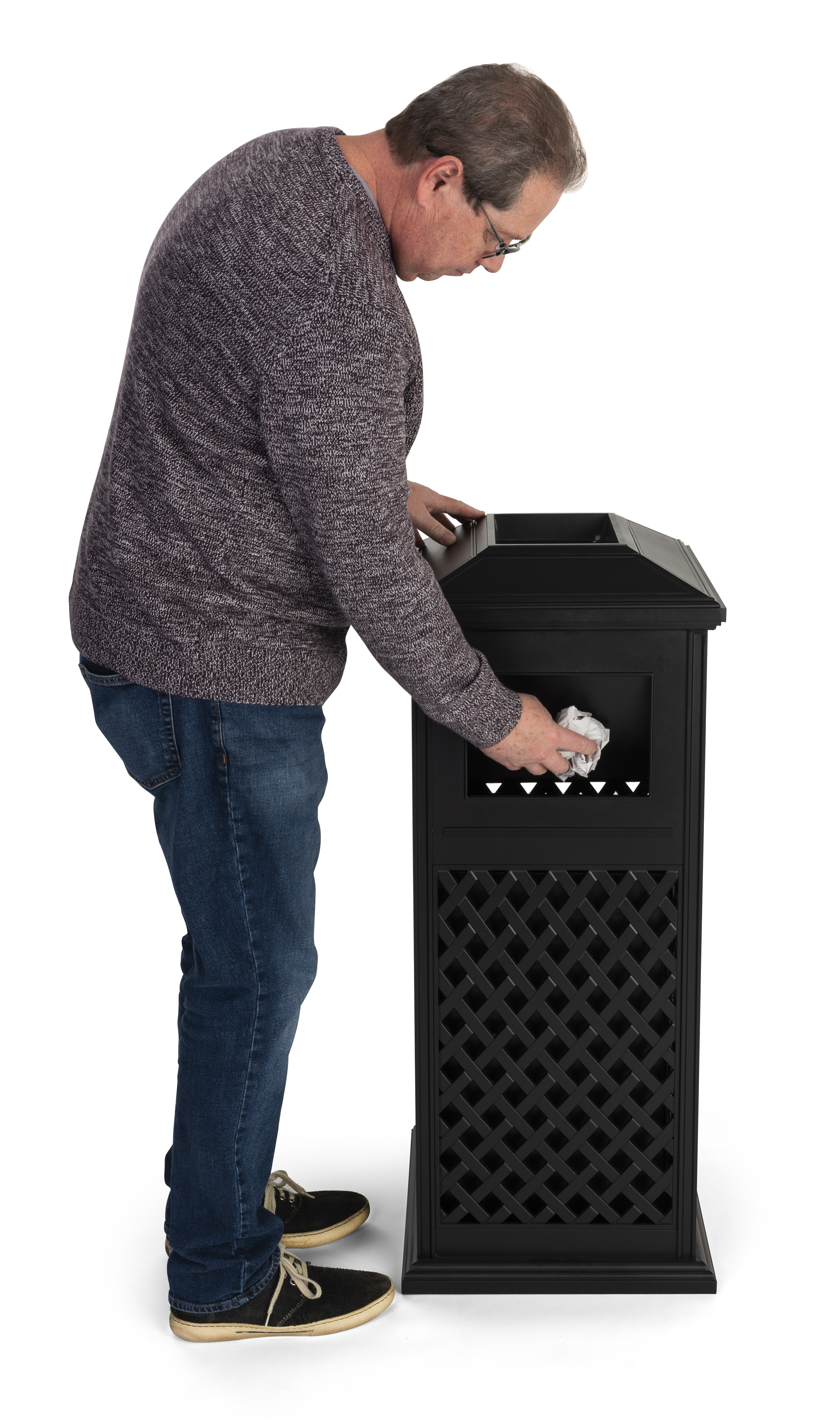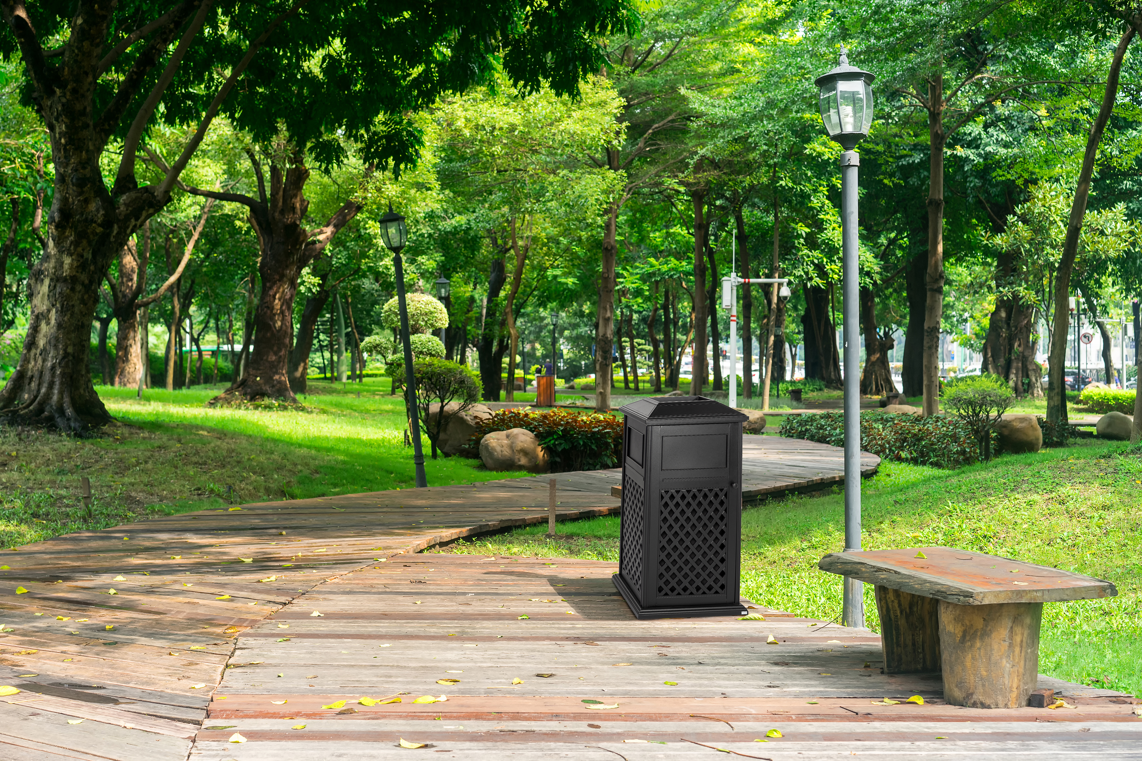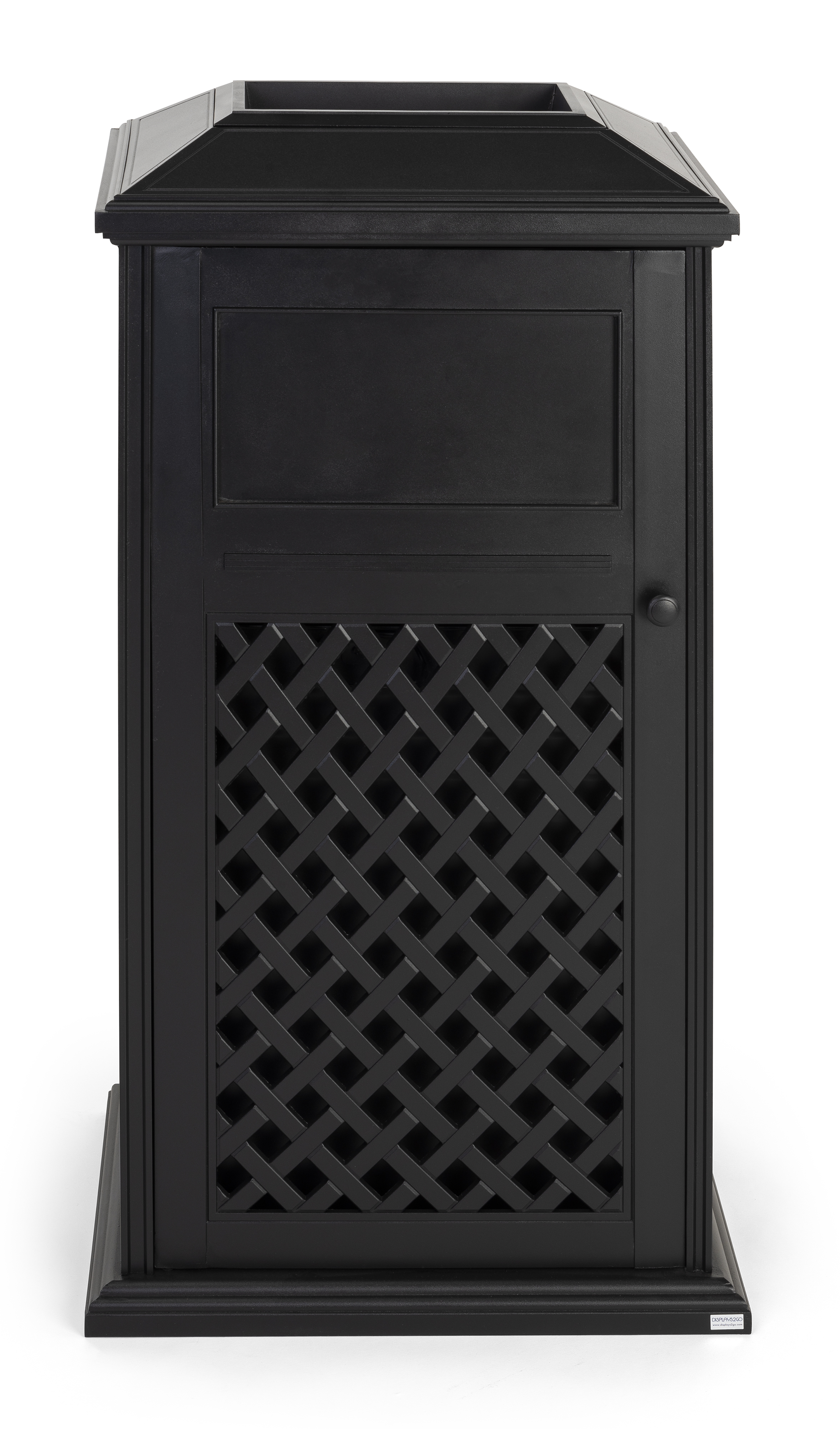 This dome top aluminum outdoor dome trash receptacle would be an excellent choice for any upscale environment. With a capacity of 17 gallons, this beautifully decorative waste bin is well suited for schools, restaurants, office buildings, or parks. This black aluminum outdoor dome trash receptacle features four panels with basket-weave design and is durable and weather-resistant. The front swing open door makes emptying full waste bins easy and effortless. A dome-shaped lid fits snugly atop the unit’s frame and includes a removable ashtray for yet another deposit access. This decorative basket weave aluminum outdoor dome trash receptacle is the perfect solution when you need to solve a sanitation need, but want an eye-appealing container.