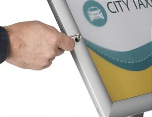 The snap frame menu pedestal comes with a PVC lens to protect contents, allowing the stylish rust-resistant fixture to be used inside or outside as needed.
