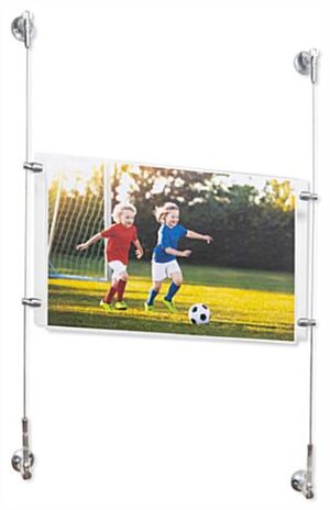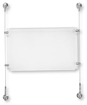 These display hanging systems, also known as cable displays, are perfect for businesses looking for relatively low cost signage that grabs the attention of the customer. This kit includes custom designed satin silver finished hardware for an elegant look to blend well with any environment. These suspended signage kits, display hanging systems include a crystal clear acrylic panel with a simple to use top-insert design. Users can quickly switch out marketing materials according to business needs. These display hanging systems are part of a large selection of cable kits in all different sizes and configurations. Purchasers can choose a pre-designed set or create a unique matrix by combining multiple different kits.