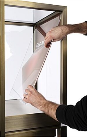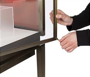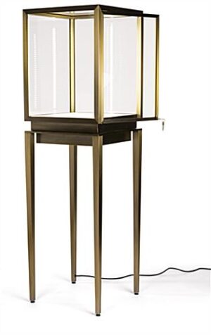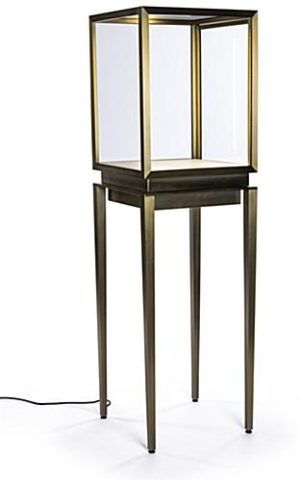 This vitrine top pedestal table showcase features a vibrant, lighted interior that highlights the finer details of jewelry and calls attention to art pieces. Its modern industrial design, featuring clean, straight lines and a white pebbled leatherette floor, perfectly accents luxury retail stores and museums alike. Use the interior sign channel of this floor standing vitrine top table showcase with tapered legs to display brand messaging, create a backdrop for 3-dimensional art, or identify a piece as part of a larger exhibition. Brushed stainless steel framing is coated in a bronze lacquer, creating a timeless appearance that adds visual appeal and feels right at home in a luxury retail environment. The locking door keeps valuables like jewelry and sculptures secure. With its LED lighted interior, gorgeous styling, and easily customizable sign channel, this vitrine table showcase elevates luxury retail displays and museum exhibitions.