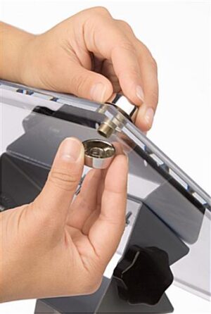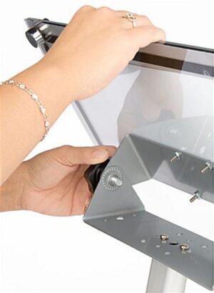 Poster stands, sign displays, and other graphic holders have a tilting bracket to mount the acrylic frame to. A tilting bracket allows you to set the angle of your graphic in place by tightening (2) knobs. These graphic holders have (2) acrylic panels held in place by (4) screws with decorative caps to securely hold your image. To place your graphic within the display, simply unscrew the (2) top corner caps, slide graphic between the two panels, and replace screws. These sign stands, graphic holders have a silver border around the acrylic to frame your poster.