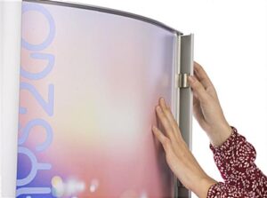 This standing poster holder displays 18” x 24” signs and graphics. Because this floor stand is double sided, trade show attendees and retail customers are sure to see the unit from all directions. Each aluminum poster holder features a snap-open frame that makes for quick and easy sign changes. A pinnacle of style and functionality, this 18” x 24” frame features a curved front. The holder stands approximately 63” from the floor, putting the display right at eye level for passersby. Purchase this double sided graphics sign stand for any hospital, school, store, café, or trade show!