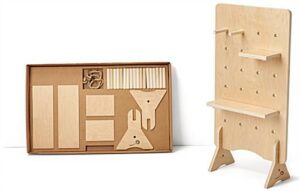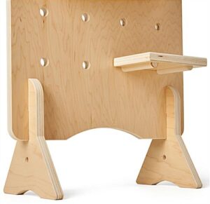 Use our wooden pegboard with shelves to keep your best-selling products front and center in retail stores, boutiques, trade shows, craft fairs, and much more. Each countertop display stand features an eco-friendly natural wood laminate finish that stands out from existing fixtures while effortlessly blending in with any space’s decor aesthetic. Without sacrificing quality or durability for a lower impact on the environment, our double-sided pegboard with shelves is thoughtfully handcrafted from sustainably grown plywood that can withstand the conditions of a busy shopping environment. Whether you need to display home goods, jewelry, stationery, or small accessories, this modern flat-pack shelving comes with four shelf attachments and 18 repositionable pegs to create quick custom visual showcases when needed. This eco-friendly pegboard with shelves and convenient collapsible design can easily be assembled and disassembled without the use of any tools. Additionally, use the included flat-pack carrying case to transport this lightweight countertop display to and from traveling events or store away when not in use. Stage this modern natural wood shelving within your retail space to create an elevated visual showcase that will make your merchandise stand out amongst any crowd!