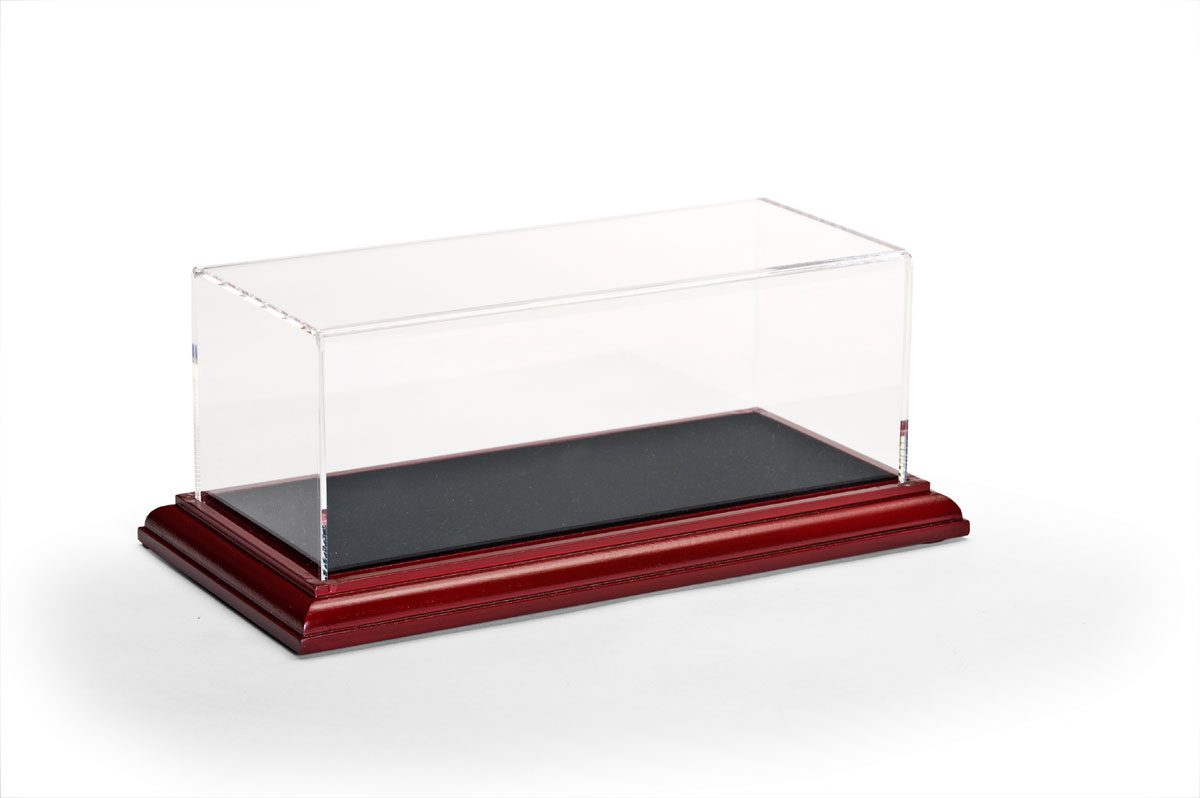 The fancy diecast car display case gives prestige to collectibles placed inside. Unlike other boxes for displaying scale nascar models, the tops of these units are constructed from 1/8″ acrylic, rather than brittle styrene. This diecast car display case that has a cherry finish base has a luxurious appearance. Viewers will immediately be drawn to the cars shown in these boxes. Die cast vehicles of all kinds look more important when put in this showcase. The deluxe diecast car display case that is for scale replicas highlights special cars. Other presentation boxes for nascar models cannot compare to the quality of this item.