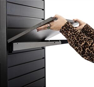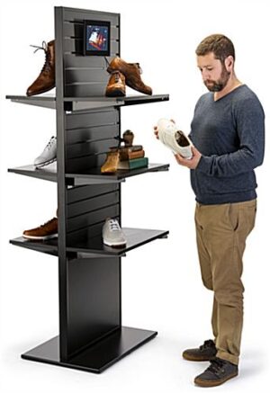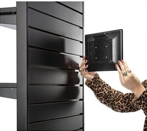 This freestanding slatwall merchandiser with digital screen is a sleek and modern way to display products at your retail store, wine shop, or beauty salon. The adjustable LCD panel provides you with the perfect advertising space to create impactful messaging and campaigns. This black slatwall merchandiser with digital screen can show JPEG, PNG, and BMP image files as well as MP4, MOV, and many other video formats. With secure USB and HDMI connections, you can easily play media from external devices in a matter of seconds. The contemporary design of this freestanding product display will lend a tasteful aesthetic to your retail store, market, or salon. Play engaging videos, slideshows with music, or post your current sale information to inform your customers more about the items you are selling on the LCD panel to assist them in their buying decision. This modern slatwall merchandiser with digital screen will quickly grab your customer’s attention and effortlessly elevate your shop’s product displays!