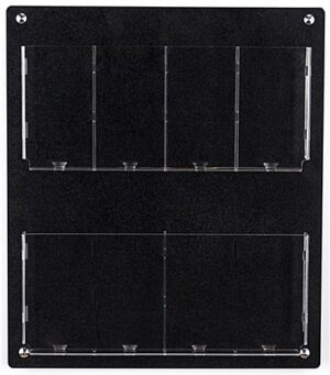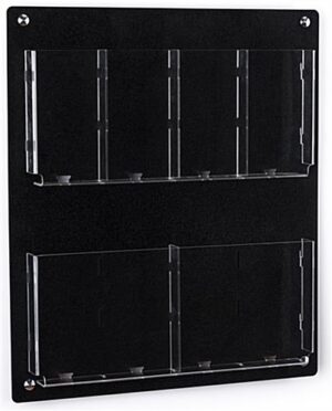This magazine rack for walls offers a contemporary solution to keep advertising pamphlets and catalogs from falling out of place and accessible for people to use in waiting rooms, banks, financial service companies, churches, and more. The literature holder is made of durable acrylic, ensuring its longevity for years to come. This sleek black magazine rack for walls ships completely assembled, ready to use, and includes 4 dividers that create 8 pockets to hold an array of literature. The transparent inserts allow you to switch out catalogs for brochures when desired and provide an unobstructed view of the reading materials. Our optional 4″ x 9″ pocket dividers will keep advertising materials organized and wrinkle-free, making them perfect in any office setting. The mounted brochure holder comes with 4 stainless steel standoffs, adding a stylish yet professional touch that will look great in law firms, classrooms, libraries, real estate agencies, and more. This easy-to-install black magazine rack for walls is excellent for displaying pamphlets and catalogs for awaiting patients and providing takeaway literature for customers.