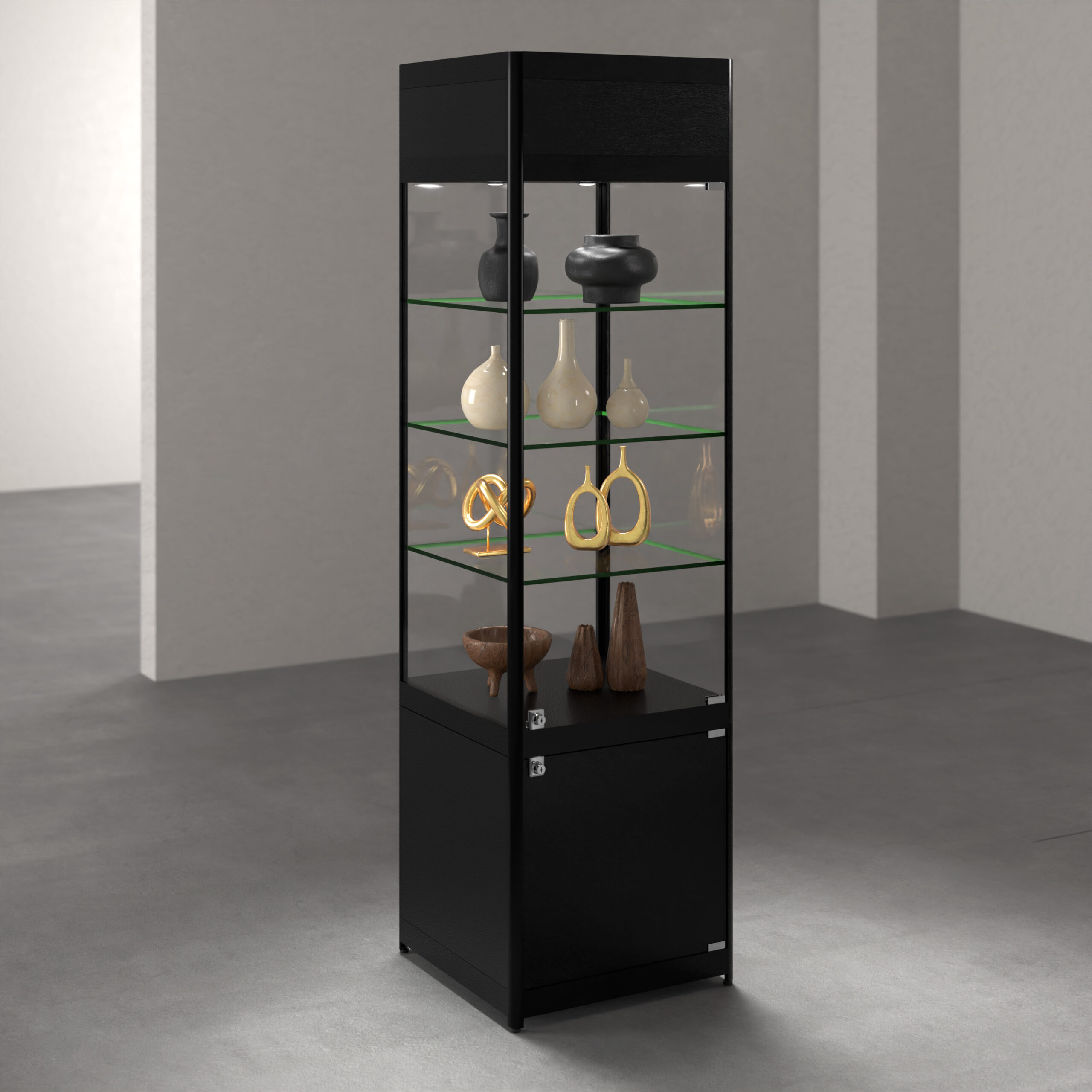 This LED retail display tower offers an elegant and practical solution for showcasing premium items in any boutique. This unit features three eco-friendly LED recessed lights to enhance product visibility with bright, energy-efficient illumination, ensuring your merchandise stands out. The modern design complements any decor, while the lockable glass case provides secure display space for jewelry, collectibles, and more. The adjustable tempered glass shelves easily accommodate various product sizes, while the built-in storage cabinet keeps additional stock within easy reach for quick replenishment. This LED retail tower combines functionality, security, and aesthetic appeal, making it an ideal showcase for any retailer.