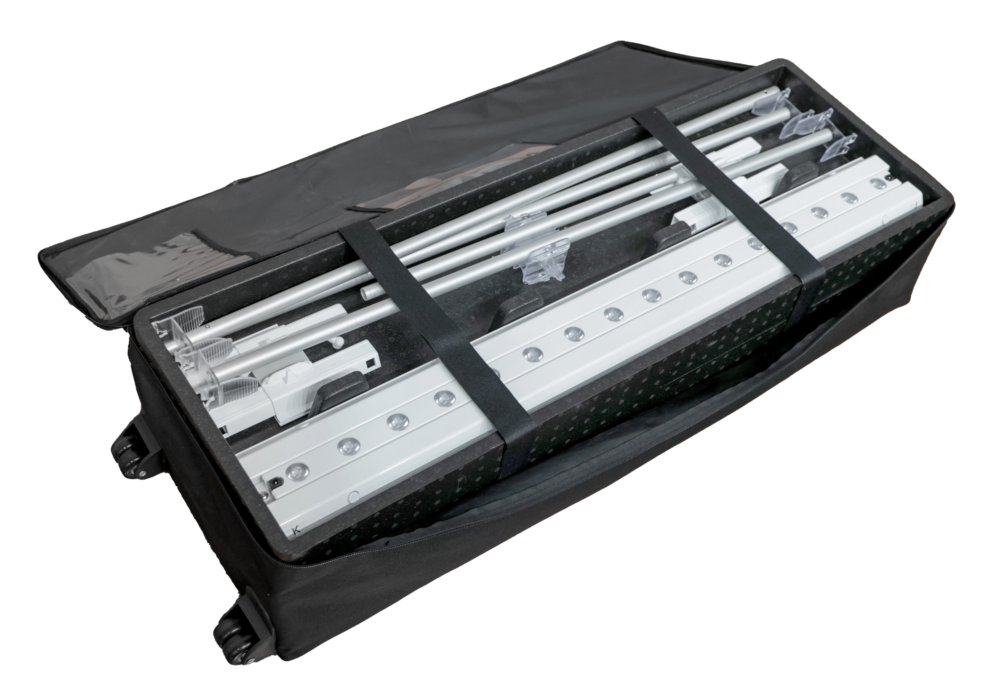 Illuminate your brand and captivate your audience with this backlit SEG trade show display, designed to showcase custom full color graphics at any event! A durable 20′ wide white PVC frame with integrated LED lighting illuminates two SEG fabric panels from the top down, adding an enticing visual element for those passing by. This backlit SEG trade show display with double-sided graphics features polyester knit tension fabric covers to showcase logos, visuals, and messaging you design, boosting your brand’s presence. Easily slide the stretch fabric panels over the illuminated PVC backwall, then secure them with the silicone edges for a smooth, wrinkle-free look. Stabilizing feet keep this backlit SEG trade show display with custom graphics secure and balanced, even in high-traffic areas, while tool-free assembly makes setup fast and effortless. A wheeled carrying case is included for easy transport and convenient storage when this 20′ wide LED lightbox is not in use. Use this custom double-sided backwall to spotlight your booth at your next event!