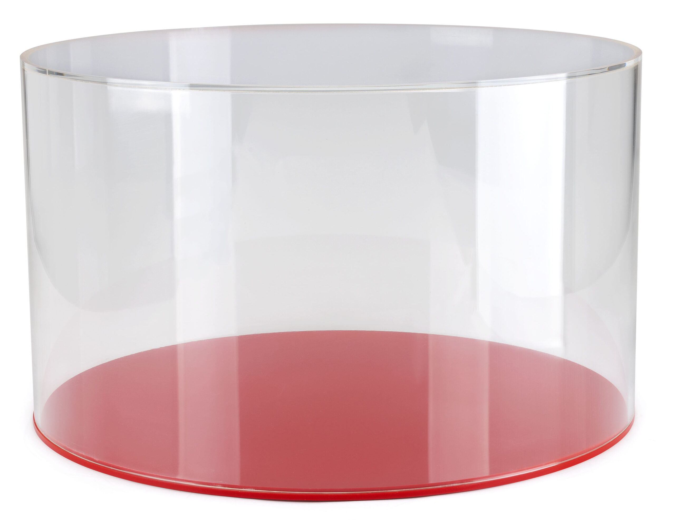 This 20″ red DCR series round plastic display case base sits securely underneath the circular clear acrylic topper. The bright, vibrant color of the 0.5″ plexiglass bottom adds a stylish element to this showcase. Each 20″ red DCR series round plastic display case base has a deep groove carved around the perimeter to help keep the lift-off style cylinder cover of the case from moving. Keep your valuables safe from dust and fingerprints in public places like museums or retail stores.