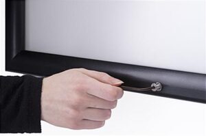Protect your poster display from the elements with a 20 x 30 black weather resistant snap frame. Featuring outdoor rated aluminum and rubber gaskets, this holder is meant for exterior use. Wall mount the lockable weather resistant snap frame then secure closed using the included allen key. A slim profile lets this poster display make an impact without taking up too much space. Use the weather resistant snap frame on an exterior wall for added advertising for products or services. Flip open the aluminum profile edges for a quick poster update as needed!
