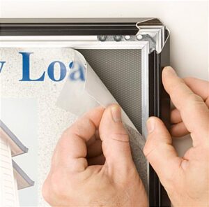 Each of the black 20 x 30 poster frames comes with a flexible, non-glare plastic lens. The plastic lens protects posters from dust and fingerprints. The molding of this black poster frame has a matte finish. This unit is thin, protruding only 3/4″ from the wall, which creates a sleek and contemporary look. The matte black finish, combined with the 1-1/4″ wide profile, creates a border around prints that captures the attention of customers, while not detracting from the poster displayed within. Shoppers in search of a 20″ x 30″ wall-mounted display that sells at an economical price have found the ideal merchandise in these snap-open picture frames!