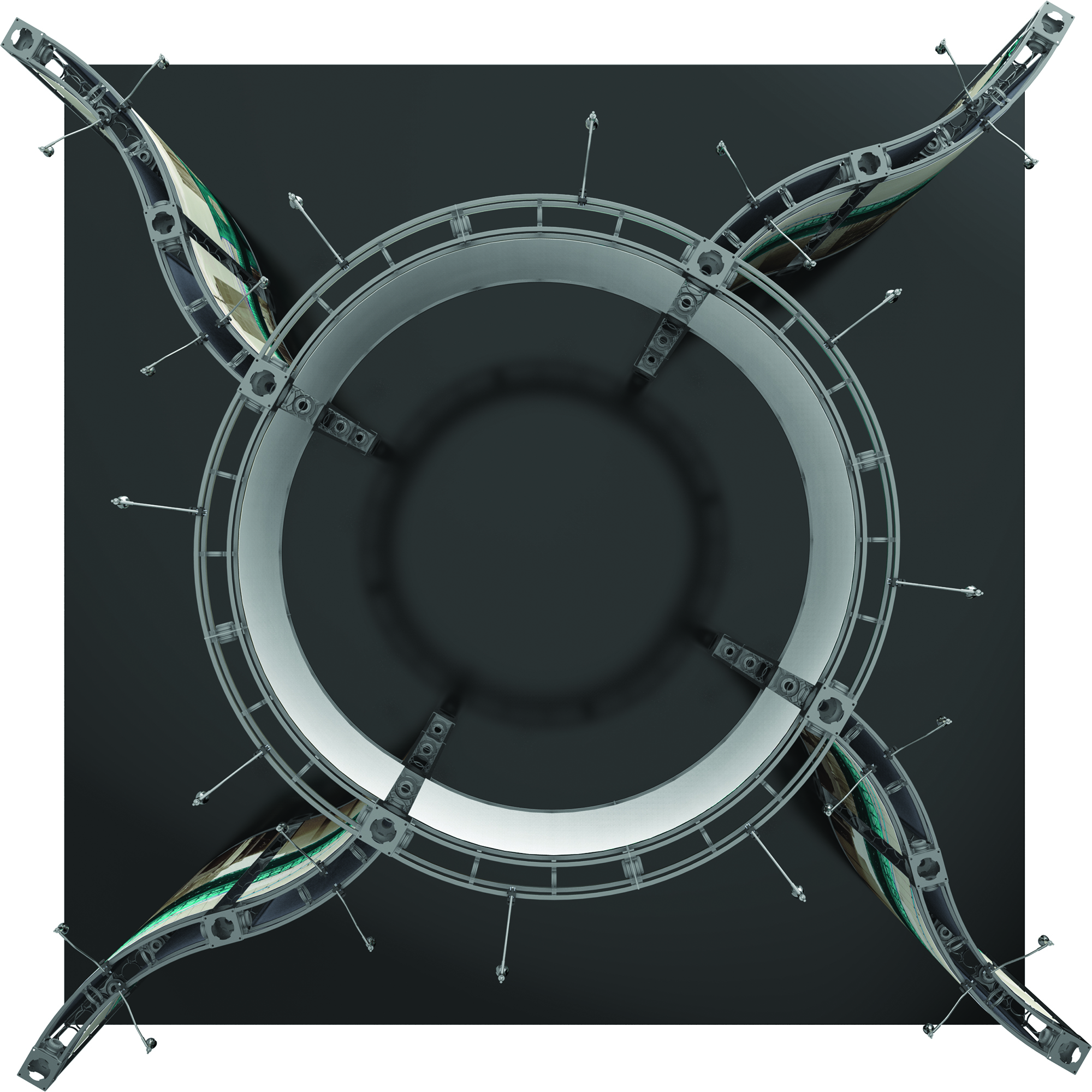 This portable trade show display booth truss includes all materials and graphics for a modern 20 ft x 20 ft expo presentation. Each easy to set up package includes 24 Lumina low voltage spotlights with bulbs and fittings, as well as 4 molded plastic transport cases. Each Orbital Express Canis trade show display booth truss is made with sturdy steel components that can be rearranged into different configurations as desired, and the tool-free twist and lock assembly makes setup easy. Stretch fabric panels are custom printed with a dye-sublimation process for brilliant full color logos or artwork. The Orbus Canis display truss has an island-style design that makes a powerful impact on the exhibition floor with it’s curved walls and raised center design.