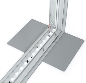 This silicone edge graphic backdrop frame is designed to accommodate our 10ft tall by 20ft wide SEG tension fabric panels (sold separately). Each large format trade show wall is constructed with sturdy but lightweight aluminum and stands on 4 steel feet. Two strips of bright LED lighting line the top and base of each light box display and can be controlled via the convenient exterior on/off switch. Internal beams provide additional support for our 20′ wide backlit silicone edge graphic backdrop frame. The portable trade show wall breaks down into numbered sections, and everything fits neatly inside the wheeled carry cases. Pair a silicone edge backdrop frame with our custom printed SEG fabric panel (sold separately) to create a complete light box display for your 20ft booth.