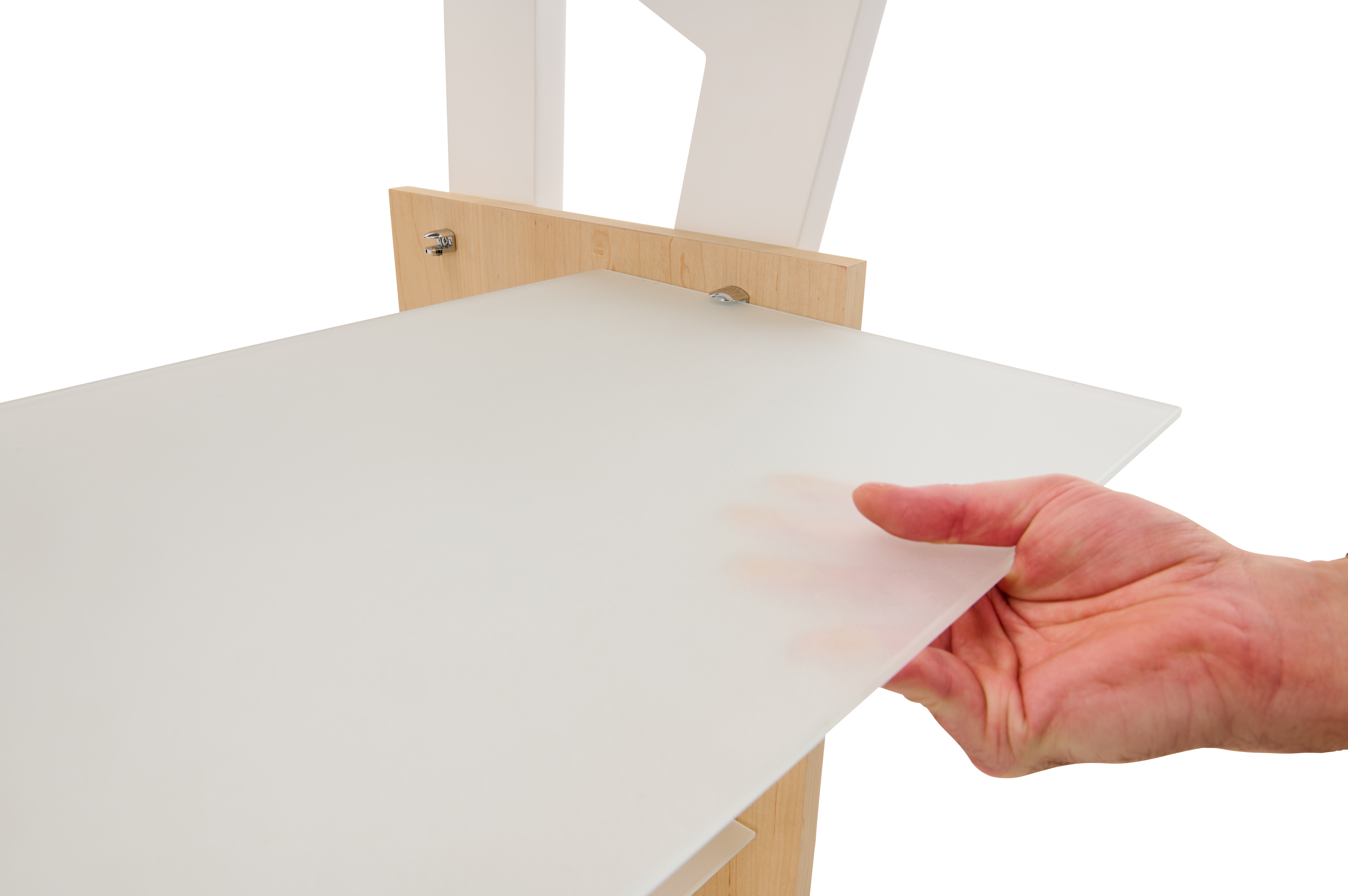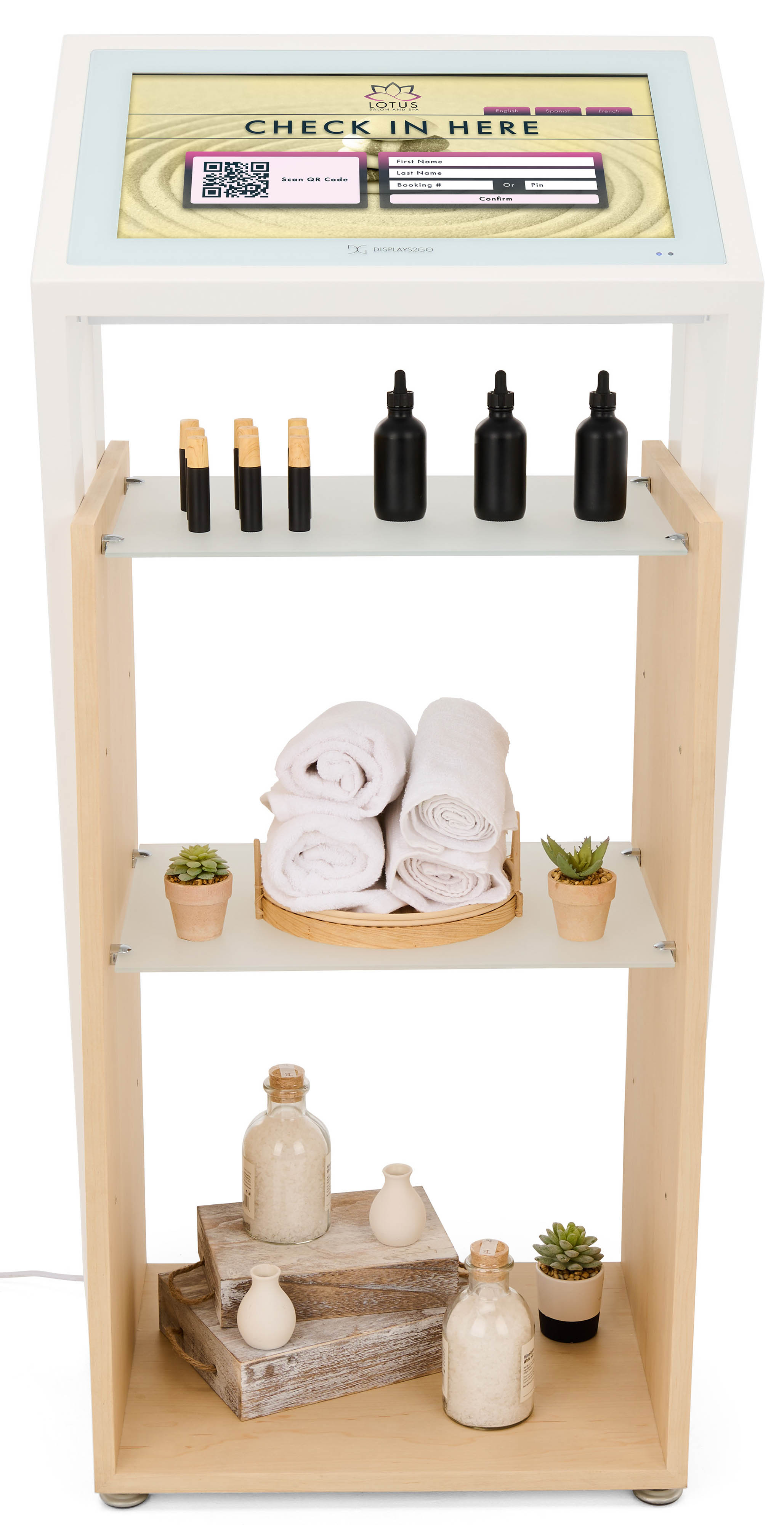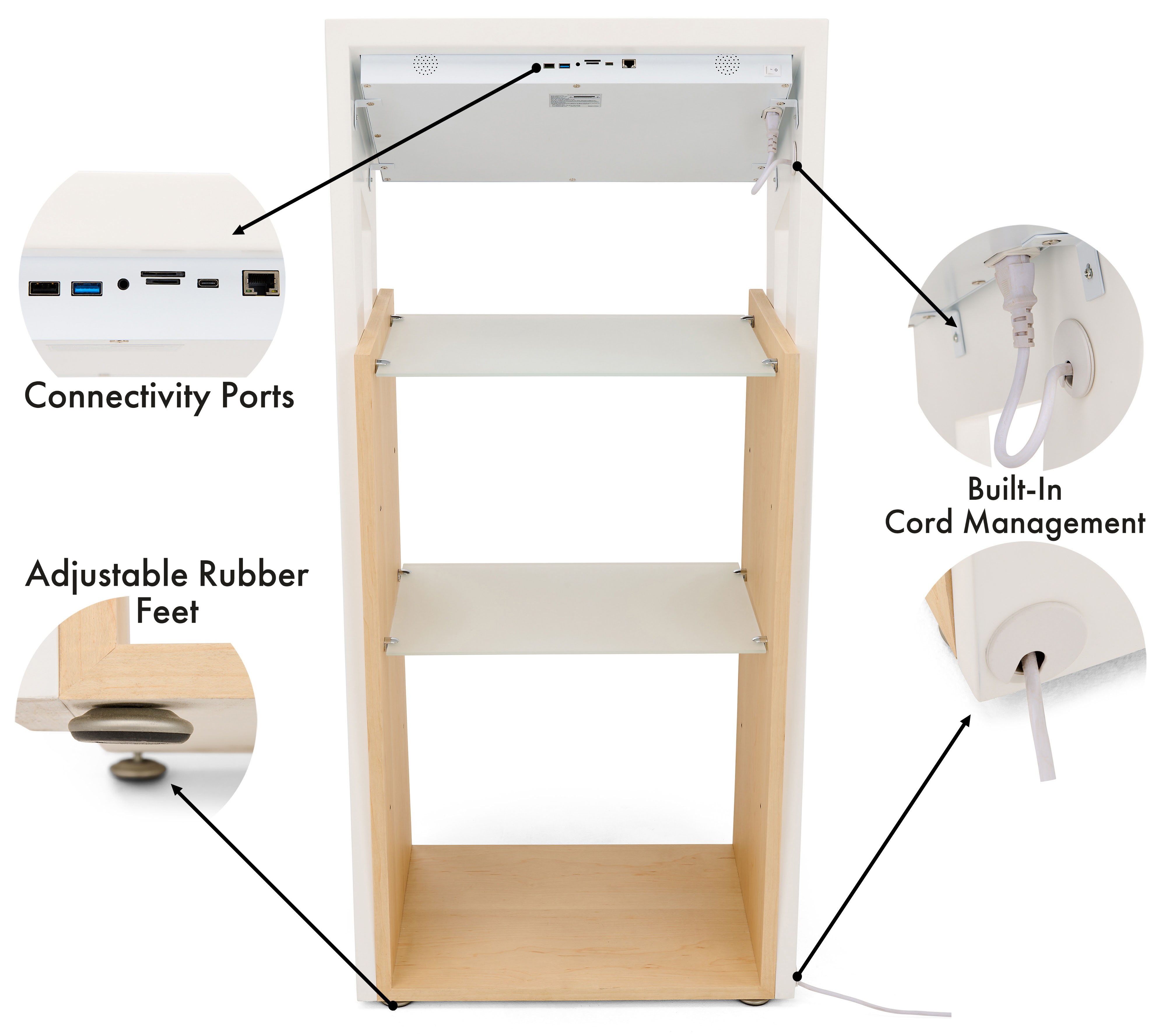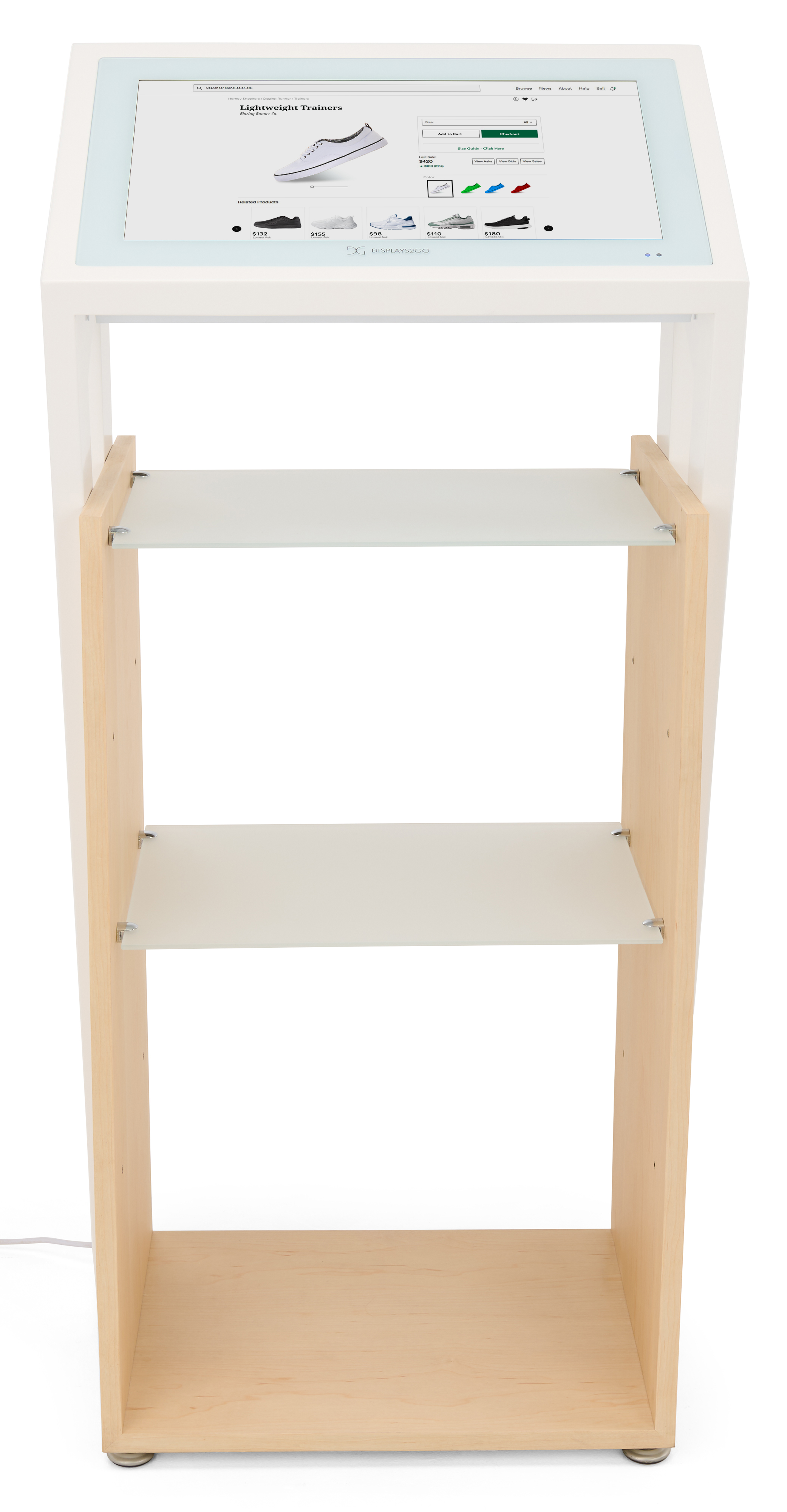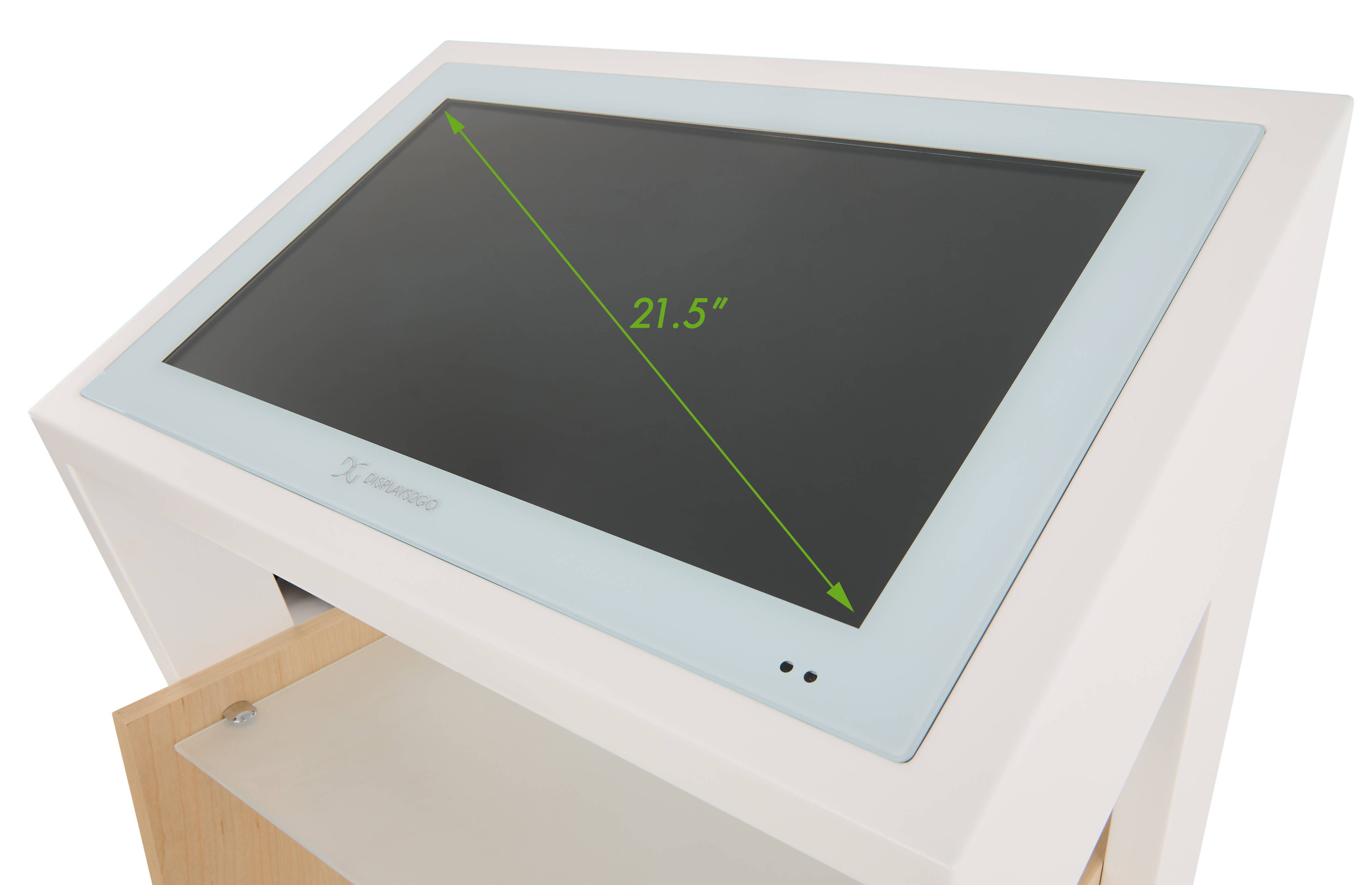 21.5″ Touch Digital Retail Kiosk, Adjustable Shelves, Android 11 – White/Maple Wood