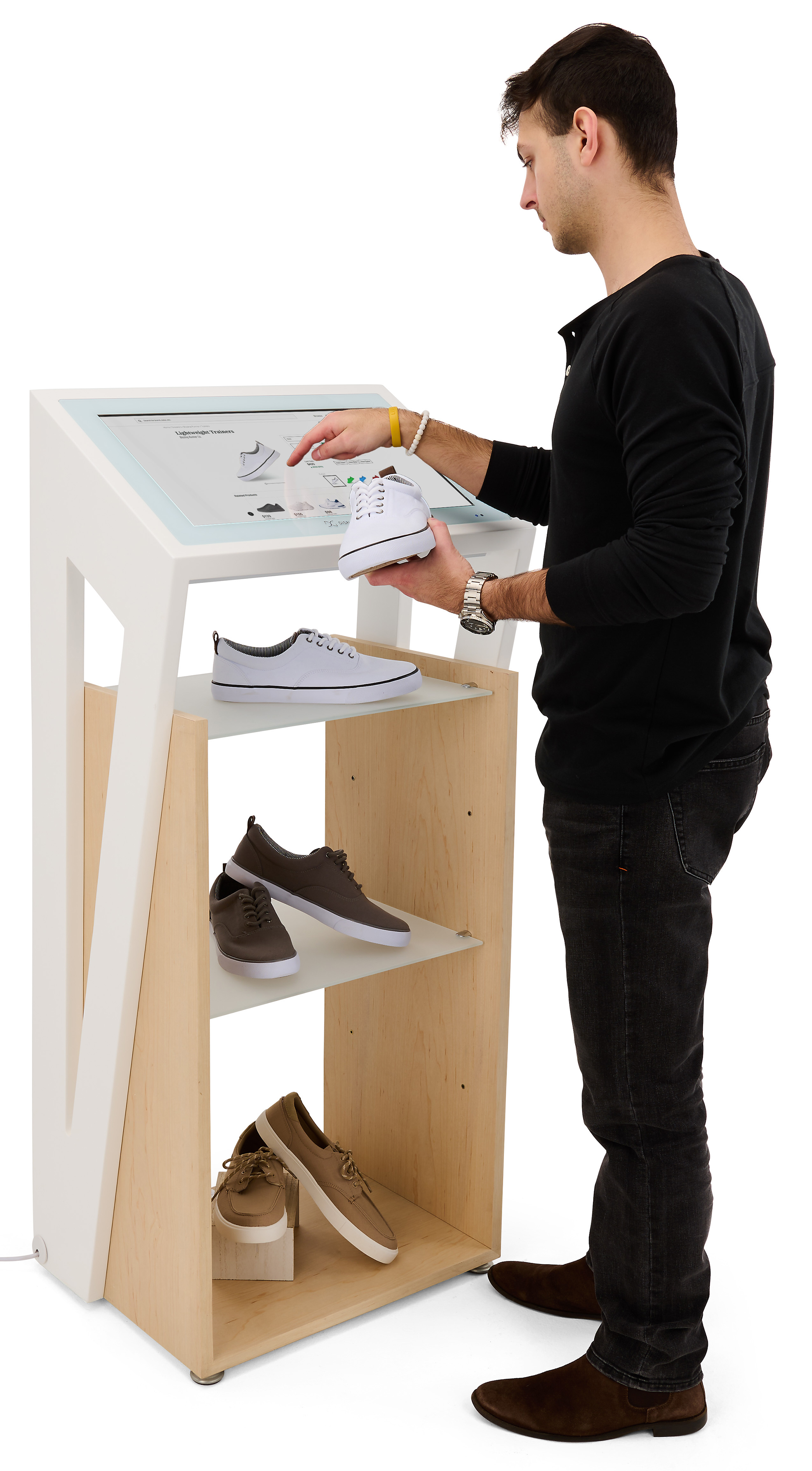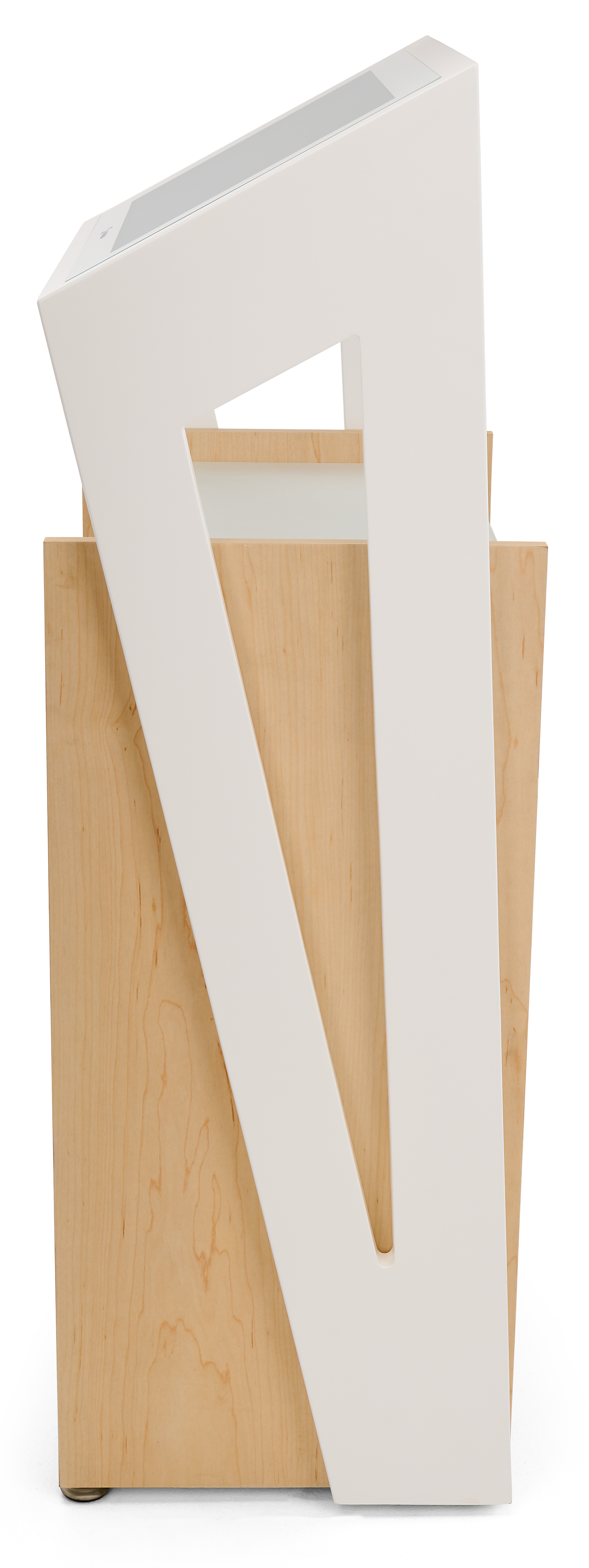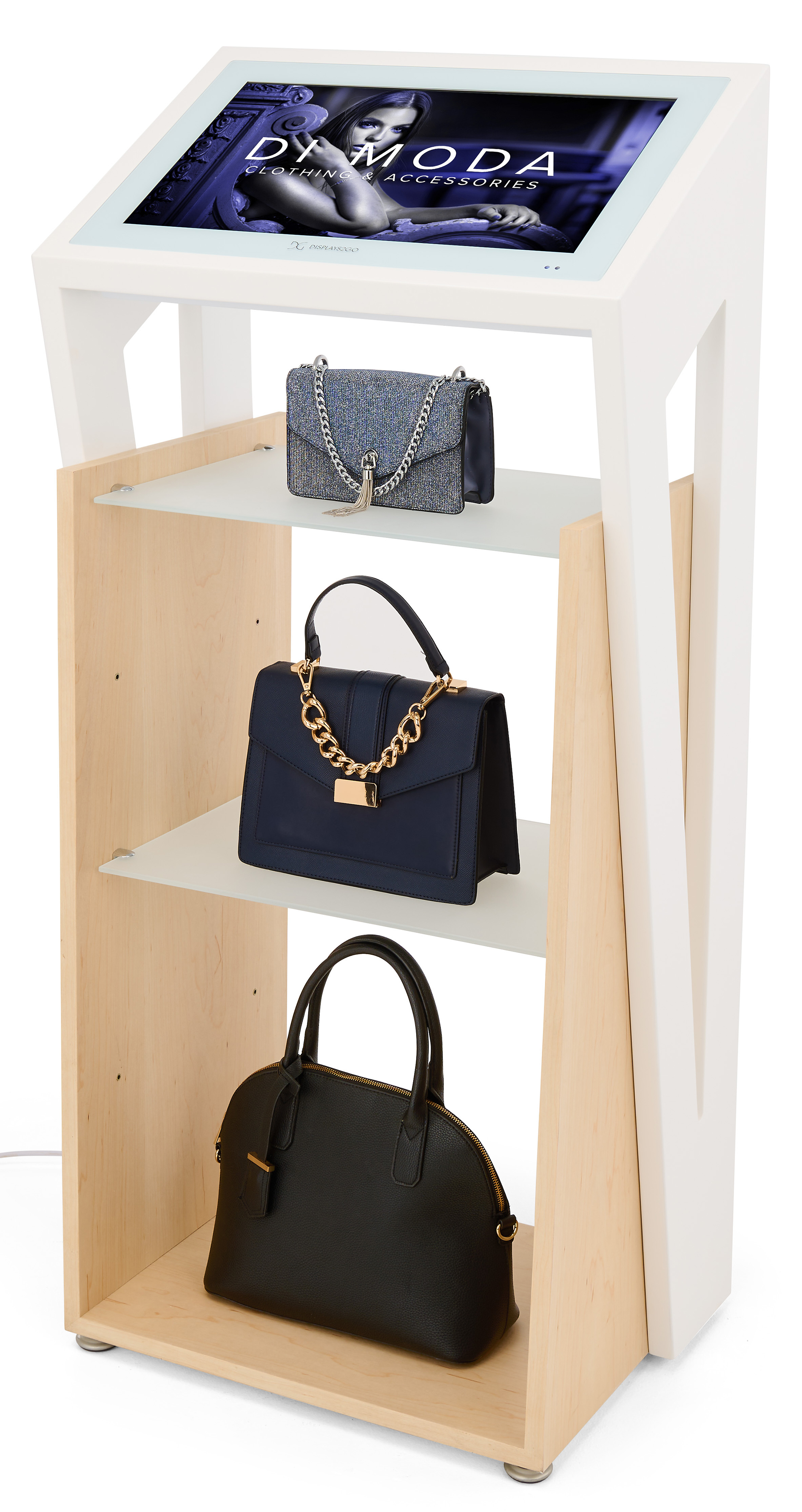 Digital Kiosk Display with Sleek Angular Design and Height Adjustable Shelves