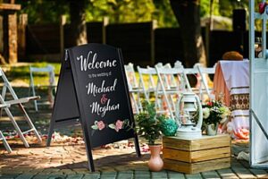 This custom chalkboard sign with digital printing can be a unique display at any restaurant, bar or wedding. The wooden A-frame is double-sided, allowing your personalized messages to be viewed from two directions. Design the black custom chalkboard sign to feature full color graphics or to only display a header-style logo or graphic, allowing you room to write restaurant menu specials or other information or messaging that needs frequent updating. The easel is compatible with both traditional stick chalk and liquid markers as well as wet erase pens. A magic eraser is included allowing you to remove and update your personalized messages. Get creative and use the custom chalkboard sign as an alternative to a traditional wedding welcome easel. The double-sided wooden A-frame folds flat for hassle-free storage. This easel will impress guests at any restaurant, bar or wedding!