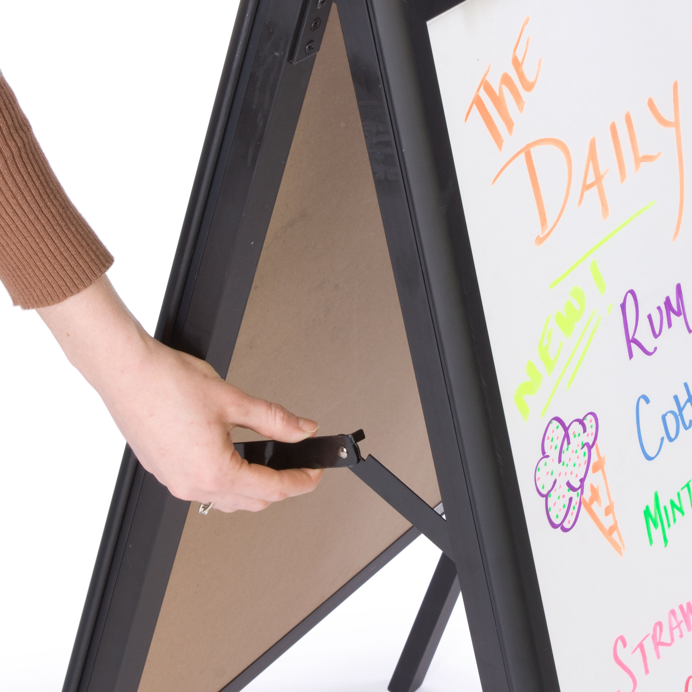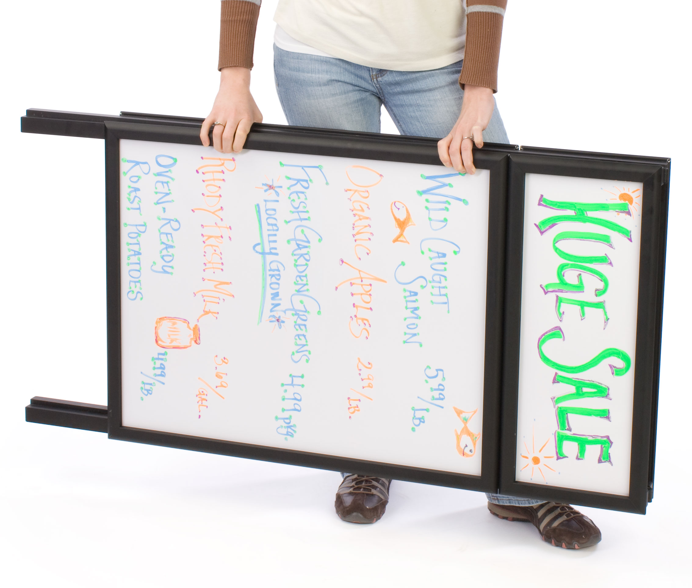 - Dual-sided white board 22″ x 28″ display advertises from two directions simultaneously.
