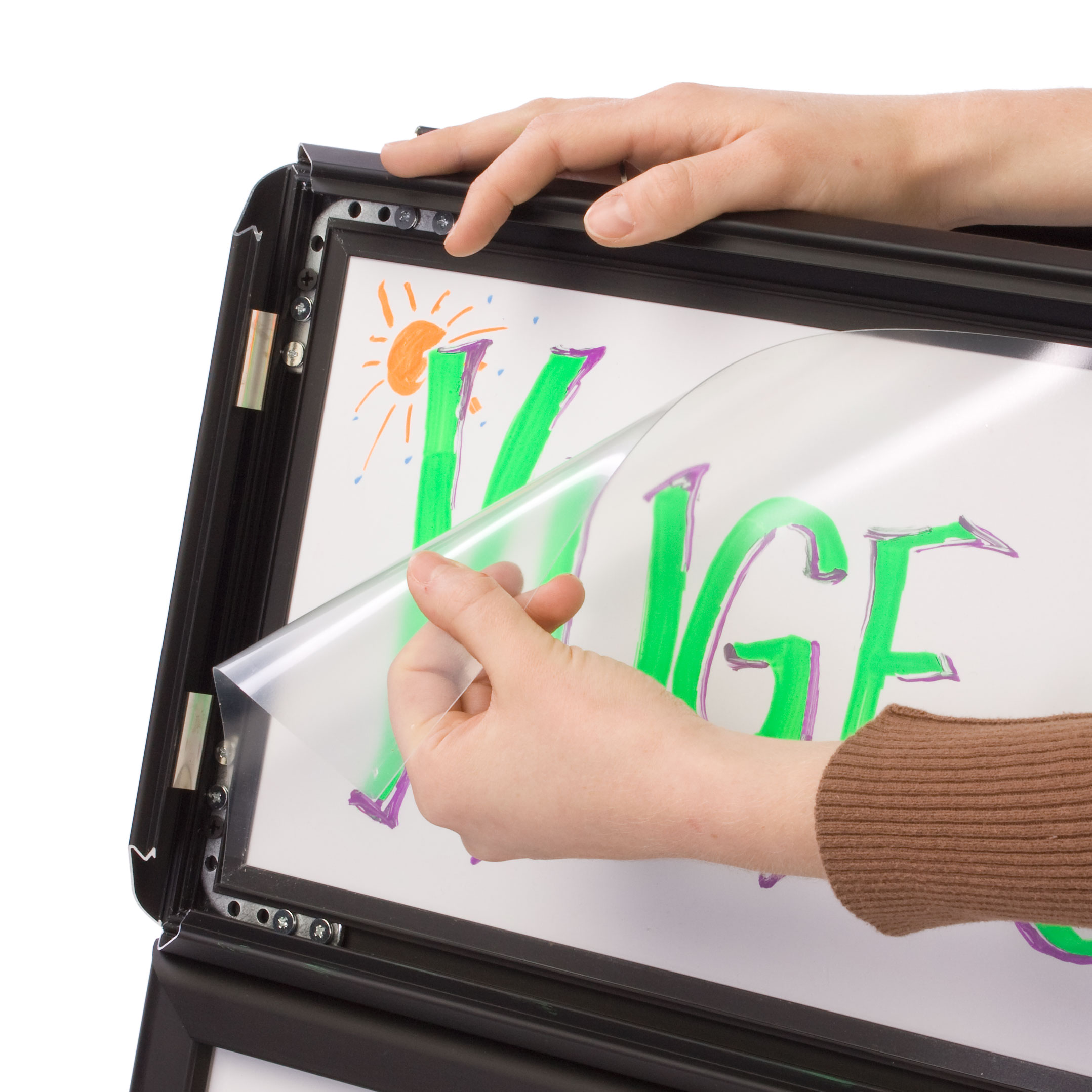 This menu board, also known as a sidewalk sign and a sandwich board, includes clear lenses for each writing surface. These lenses help to prevent tampering of your board and protect the board from the elements. A sandwich sign, menu board features side hinges that allow you to collapse the frame to easily be moved or stored in a smaller space. This feature is perfect for establishments that want to advertise during the day and bring the display in at night. A menu board utilizes snap frames to hold protective lenses in place. Snap frames allow you to easily access and remove the lenses without any tools required, simply snap open and shut. Purchase a sidewalk sign, menu board today for a great display that advertises to multiple directions at once to really grab passersby’s attention.
