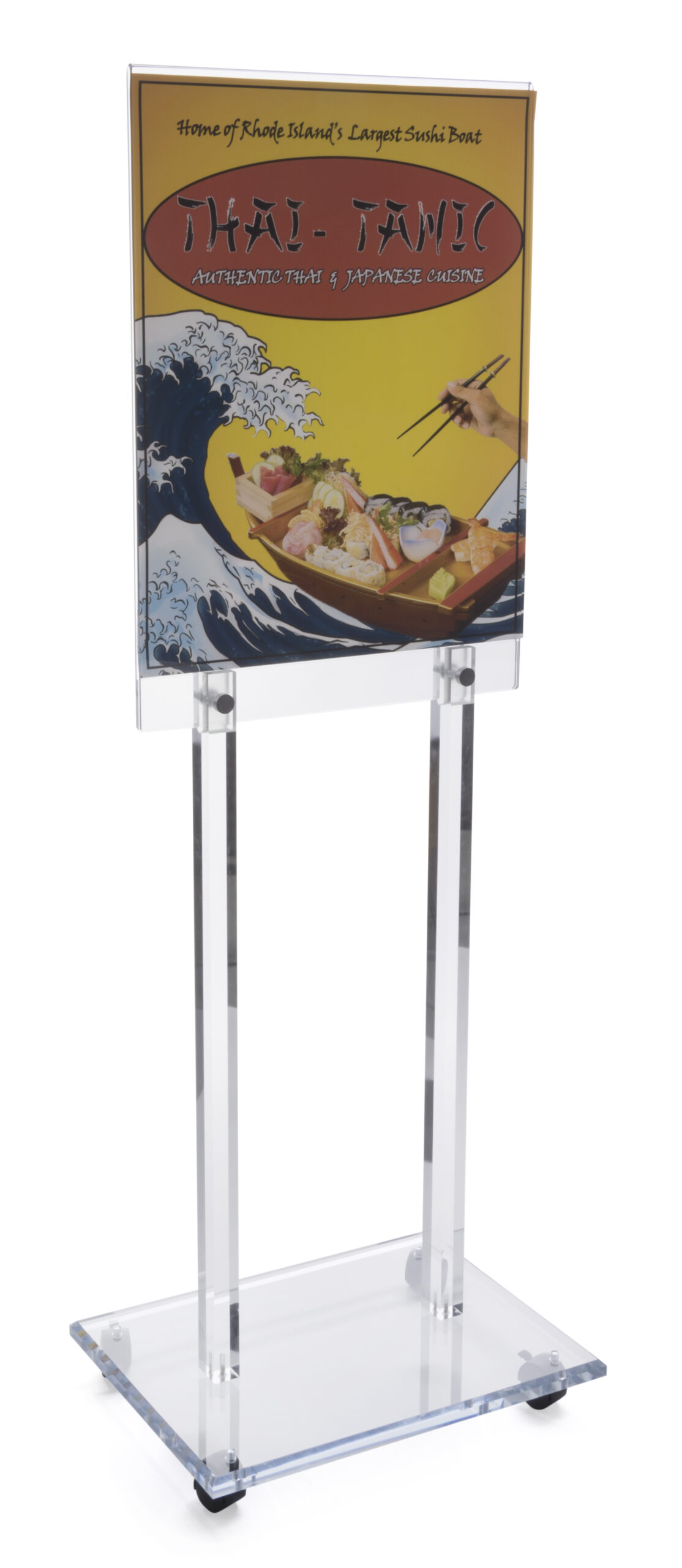 Display Rack – This display rack and poster unit stands 67″ tall and holds (2) 22″w x 28″h posters for double sided viewing. This acrylic poster holder stand moves freely on (4) locking casters. Upscale, thick, polished acrylic draws attention to your posters and brochures! Easy assembly required, all hardware provided for this floor display. Base dimensions are 24″ wide by 18″ deep. Ships in two boxes.