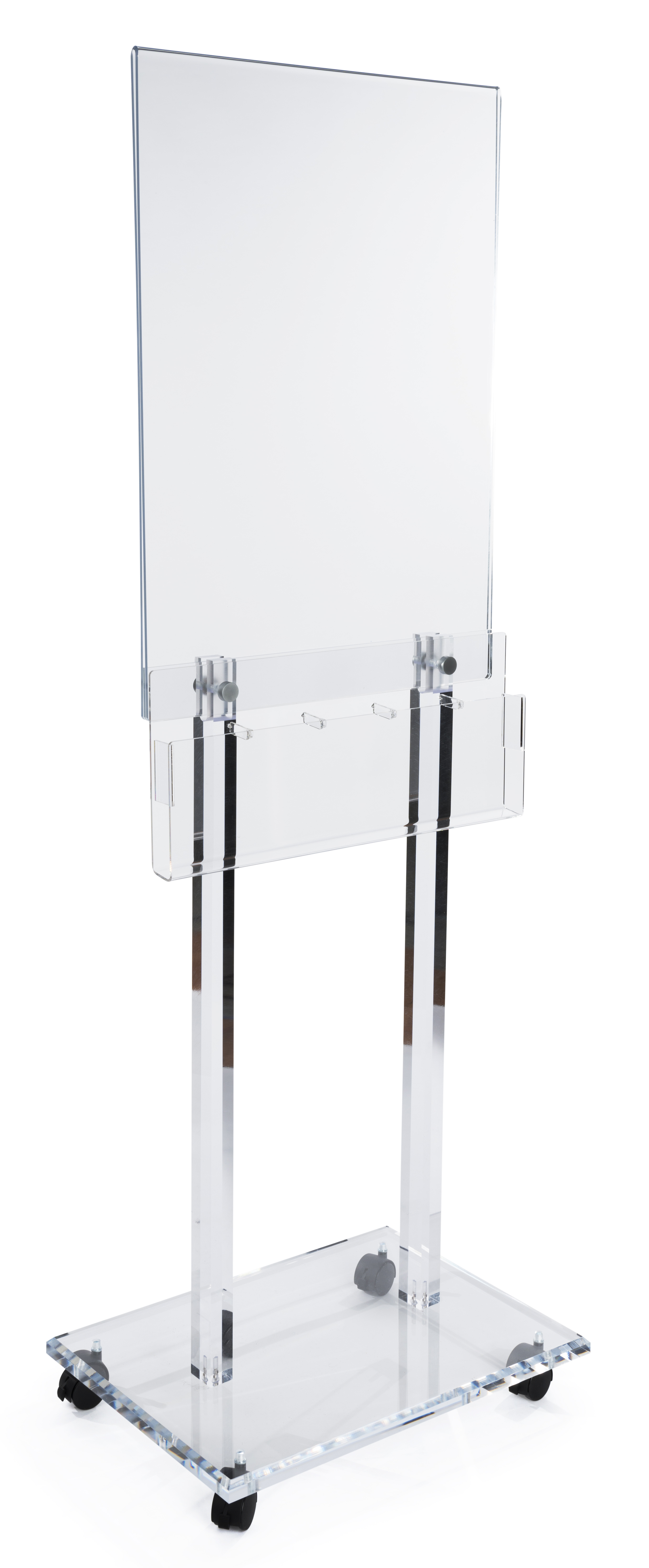 This display stand for posters and literature stands 67″ tall and holds (2) 22″w x 28″h posters for double-sided viewing. The 5-pocket brochure holder attachment on one side with adjustable dividers fits magazines and pamphlets for grab-and-go literature. The pocket rack can be configured anytime for standard 4″ wide brochures or 8 1/2″ wide literature. This floor standing acrylic sign display stand moves freely on (4) locking caster wheels for easy transportation and positioning. Easy assembly and all hardware provided makes setup effortless. The base dimensions are 24″ wide by 18″ deep so you can rest-assured that this stand is sturdy and will not move in high foot traffic areas.