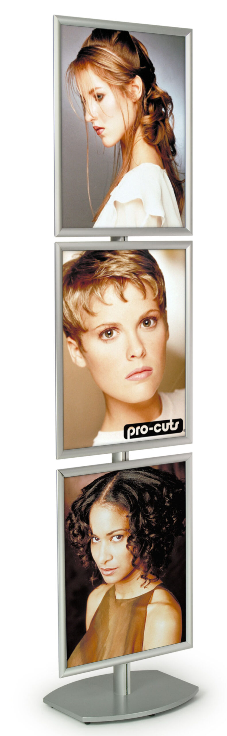 This 8ft sign frame stand is a great way to display large posters and advertisements! Constructed of an 8ft aluminum pole, heavy base and three 22″ x 28″ poster holders, this sign frame will surely grab the attention of passersby. Use your sign frame stand within busy retail stores, trade shows, or high-traffic areas. Each poster holder on this sign frame stand has an easy-to-use, snap-open design that makes poster changes a breeze. Unlike sign frames that load from the back, the poster holder does not have to be removed to switch your image. Just lift open the sides of the frame, insert your poster or sign, and snap the sides down again. This sign frame stand comes with Lexan overlays to reduce glare while protecting your advertisements. Use this hassle-free display system as a retail display or lobby fixture to entice your audience.